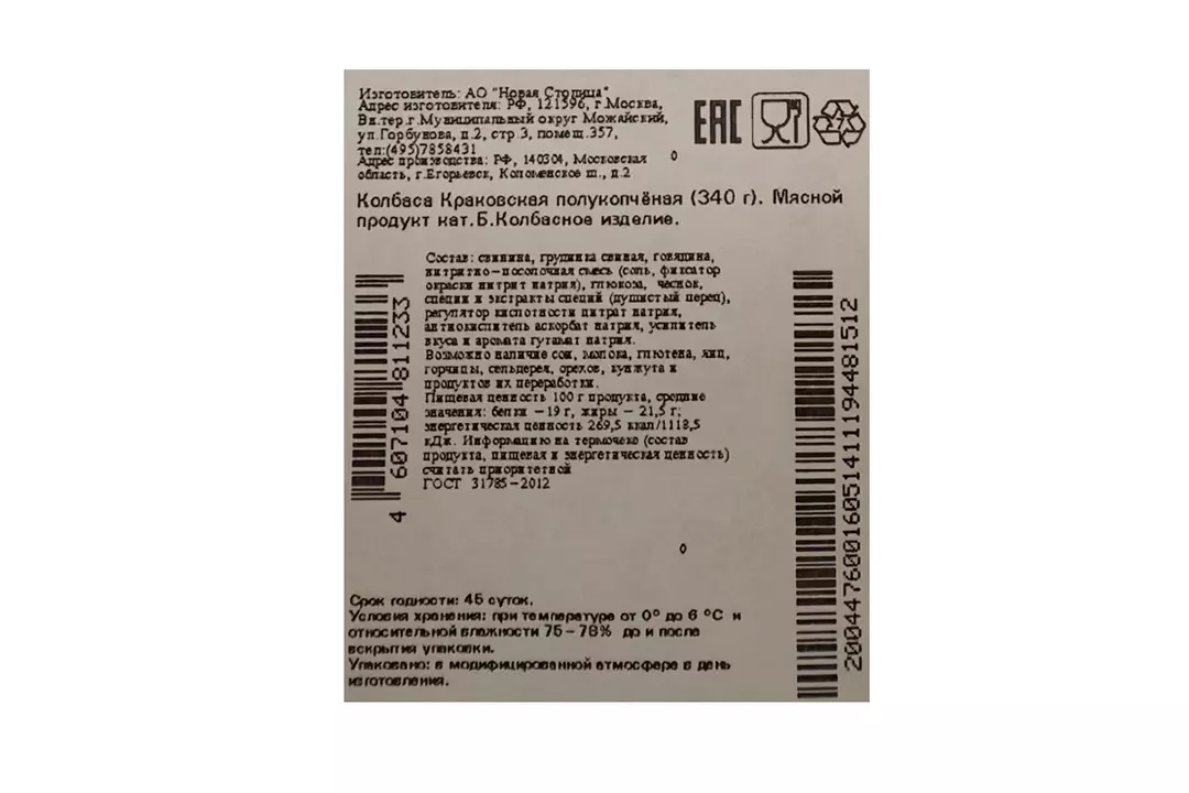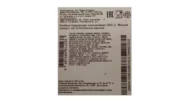Краковская отличается наличием крупно рубленой грудинки в смеси свиного и говяжьего фарша, характерным ароматом чеснока, душистого и черного перца. Колбаса имеет яркий вкус копчения, которому способствует оболочка натуральная черева. По традиции Краковской придают вид аппетитной коляски. Егорьевская колбасно-гастрономическая фабрика. Категория Б. Страна-производитель Россия