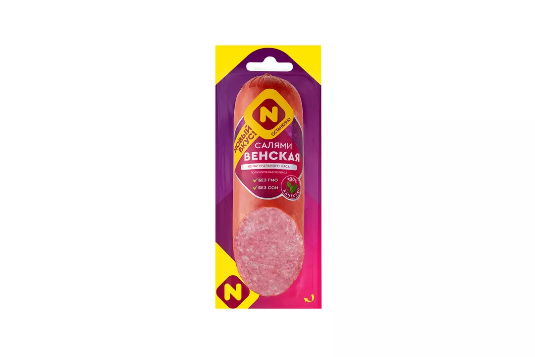 Салями Венская от «Останкино» — Вкус Европы на Вашем столе! Приготовьтесь открыть для себя изысканный вкус Вены! Наша салями создана для тех, кто ценит насыщенный вкус и аромат настоящей сырокопченой колбасы. Это не просто закуска, а настоящая кулинарная классика, которая украсит любой прием пищи. Почему вам понравится Венская салями от «Останкино»? Богатый вкус и аромат: Мы используем уникальную смесь благородных специй — черный перец, мацис, кардамон, тмин и горчицу, которые придают колбасе неповторимый пикантный вкус и запоминающийся аромат. Нежная текстура: Специально подобранные ингредиенты обеспечивают приятную, нежную консистенцию, которая тает во рту. Аппетитный вид: Насыщенный розовый цвет и равномерное распределение шпика делают эту салями невероятно аппетитной. Универсальность в употреблении: Идеальна для завтрака в виде нарезки для бутербродов. Станет ярким акцентом в сырной тарелке или мясной нарезке. Прекрасно дополнит вкус пиццы, пасты и салатов. Превратит обычный бутерброд в гастрономический шедевр. Страна-производитель Россия