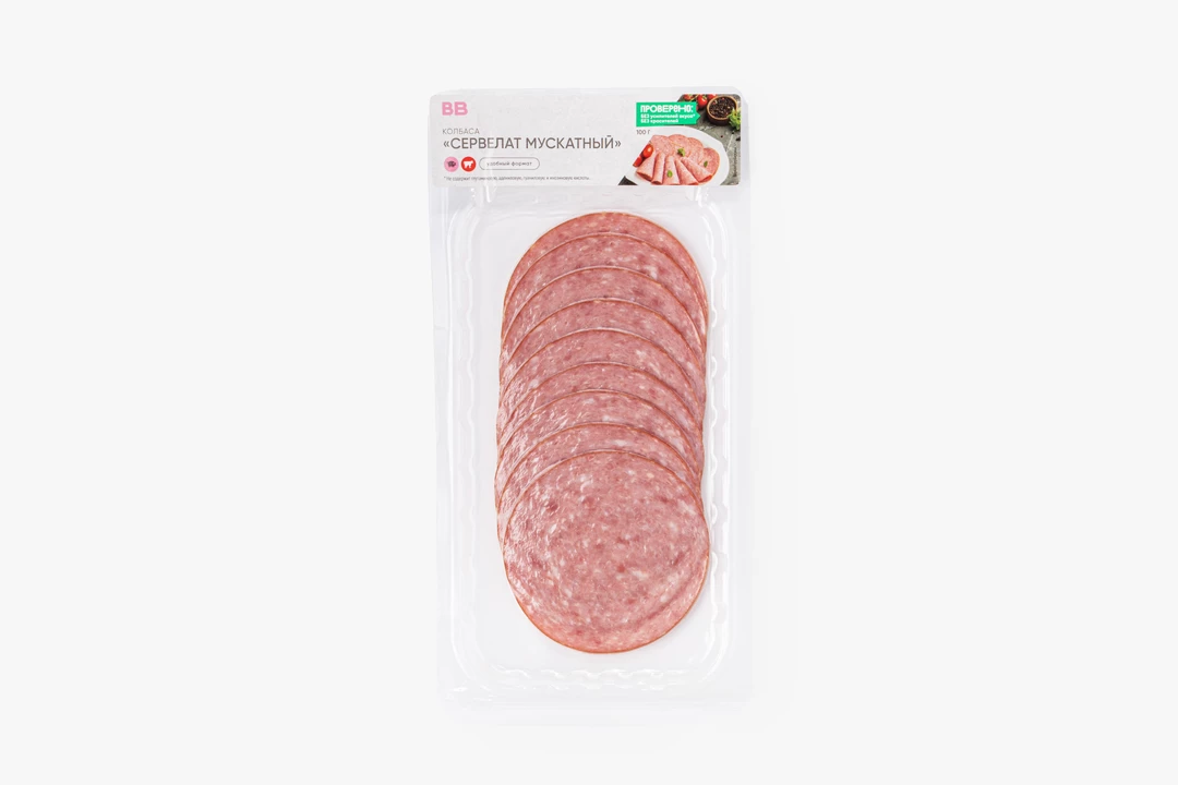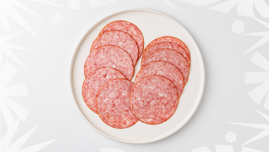 Полукопчёный сервелат из свинины и говядины. Нежный мясной вкус, тонкий мускатный оттенок и едва уловимый копчёный привкус. Классика в чистом виде. Ломтики тонкие, эластичные, среднего диаметра. Можно положить на бутерброд или скрутить в рулетики, добавив сырную начинку.