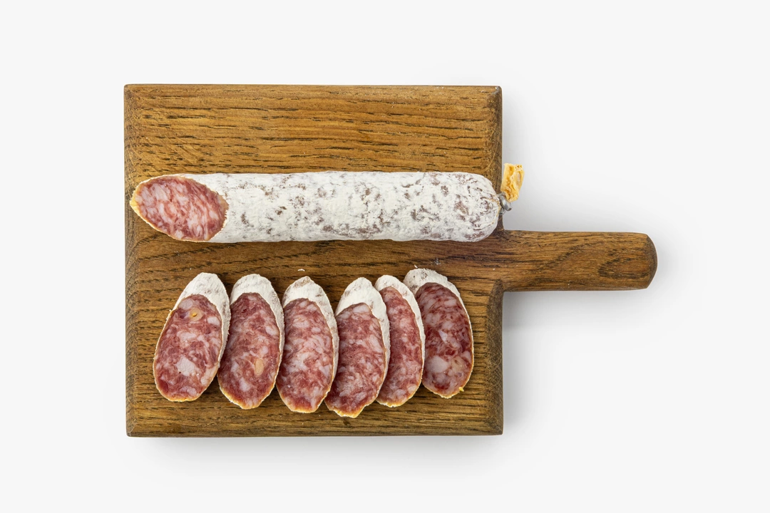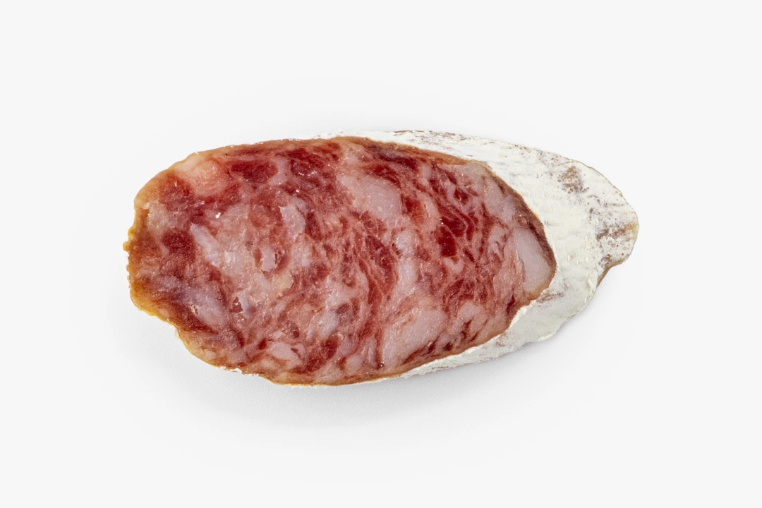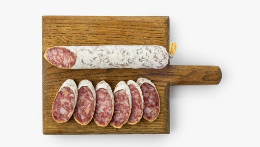 Изысканная сыровяленая колбаса с благородной плесенью и кедровыми орехами. Свинина создаёт плотную текстуру, а белая плесень на поверхности образует характерный бархатистый налёт. Дроблёные кедровые орешки подчёркивают глубину мясного вкуса, добавляя лёгкую сладость и ореховые нотки. Ломтики колбасы хороши сами по себе в составе мясной тарелки или с хрустящим багетом. Попробуйте также сочетать их с мёдом или грушей, чтобы оттенить пикантный аромат.