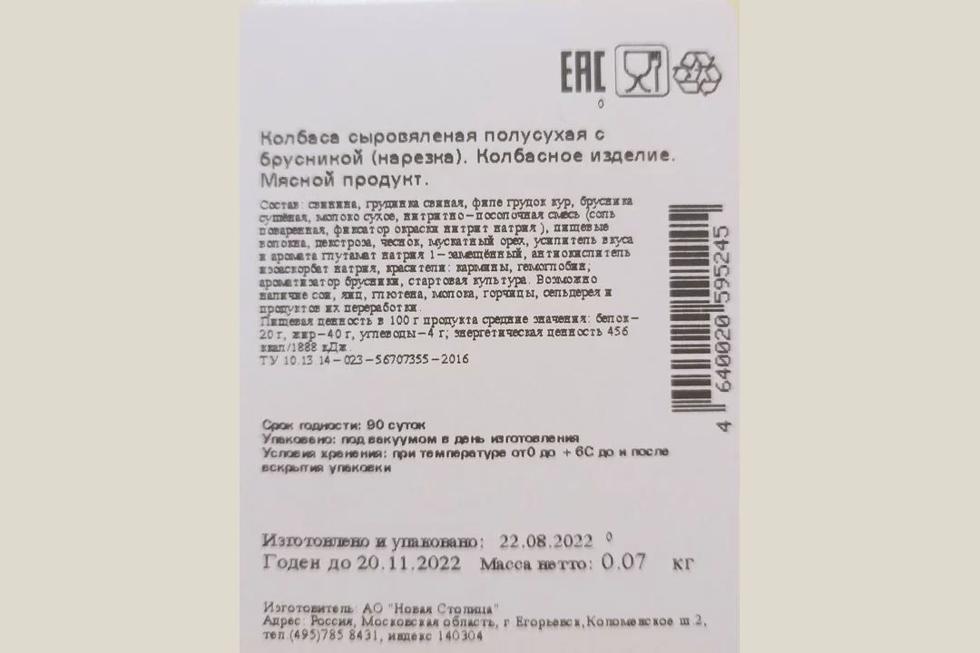 Колбаса сыровяленая Егорьевская ФКГ с брусникой нарезка 70 г / Супермаркет