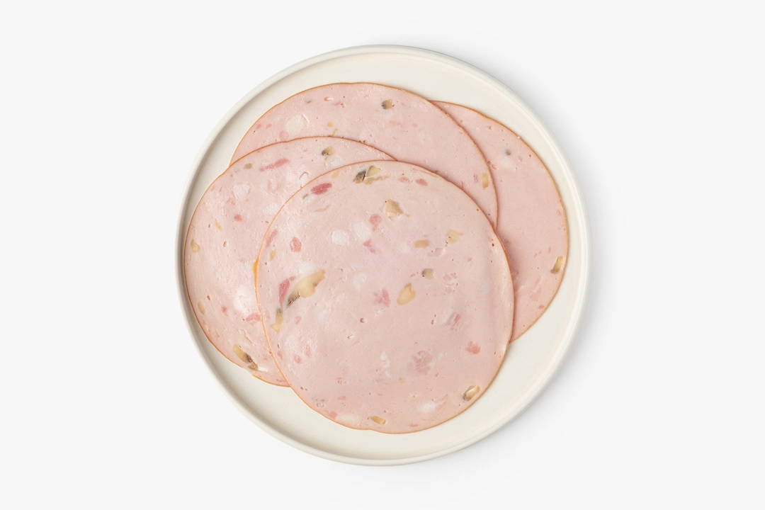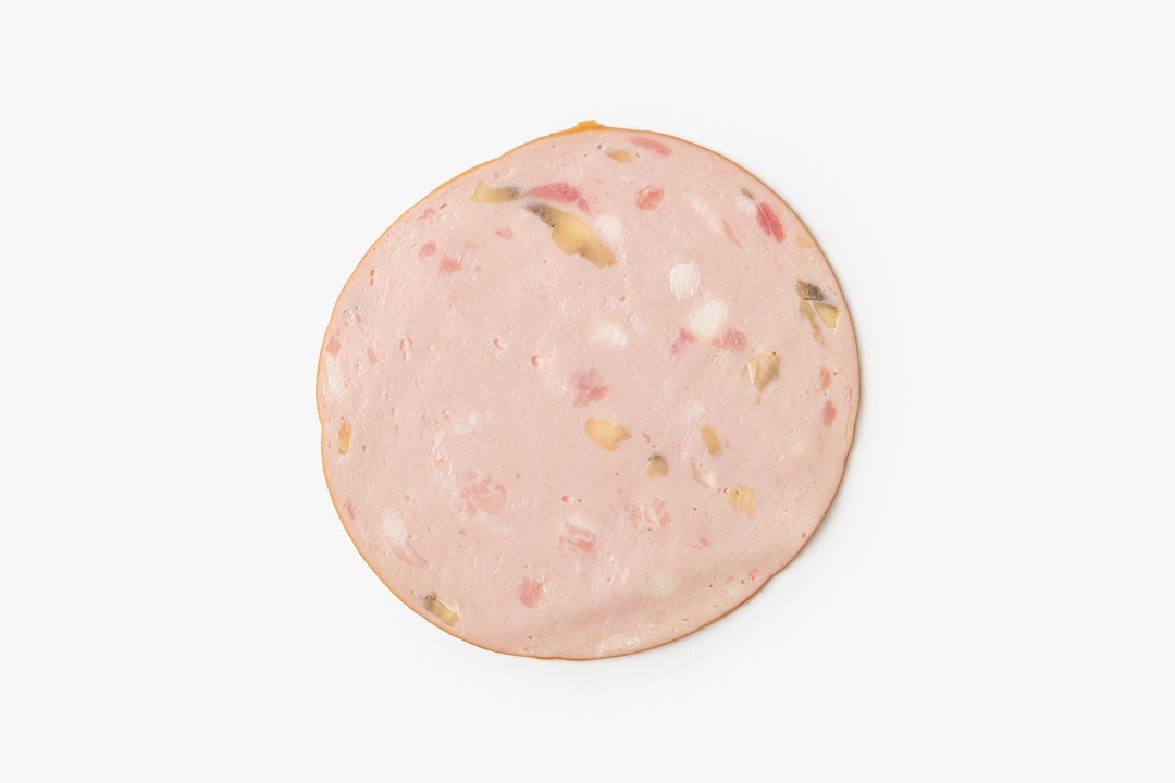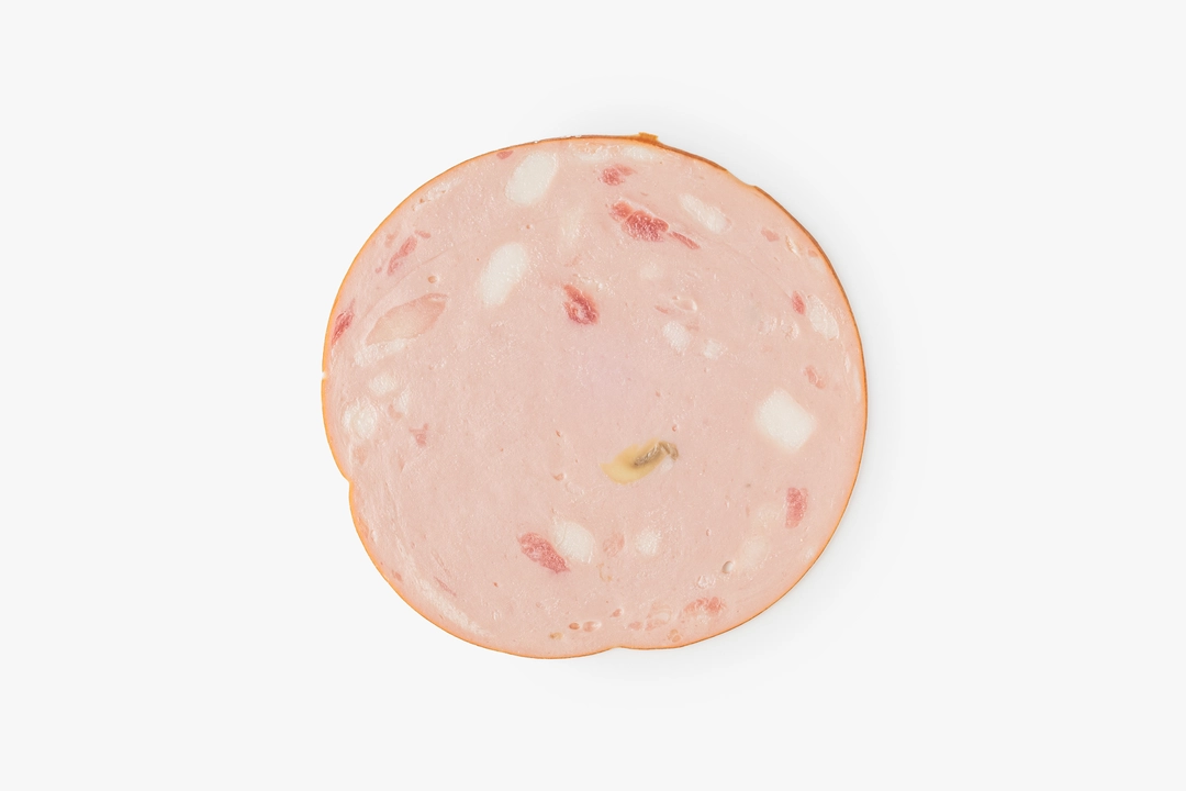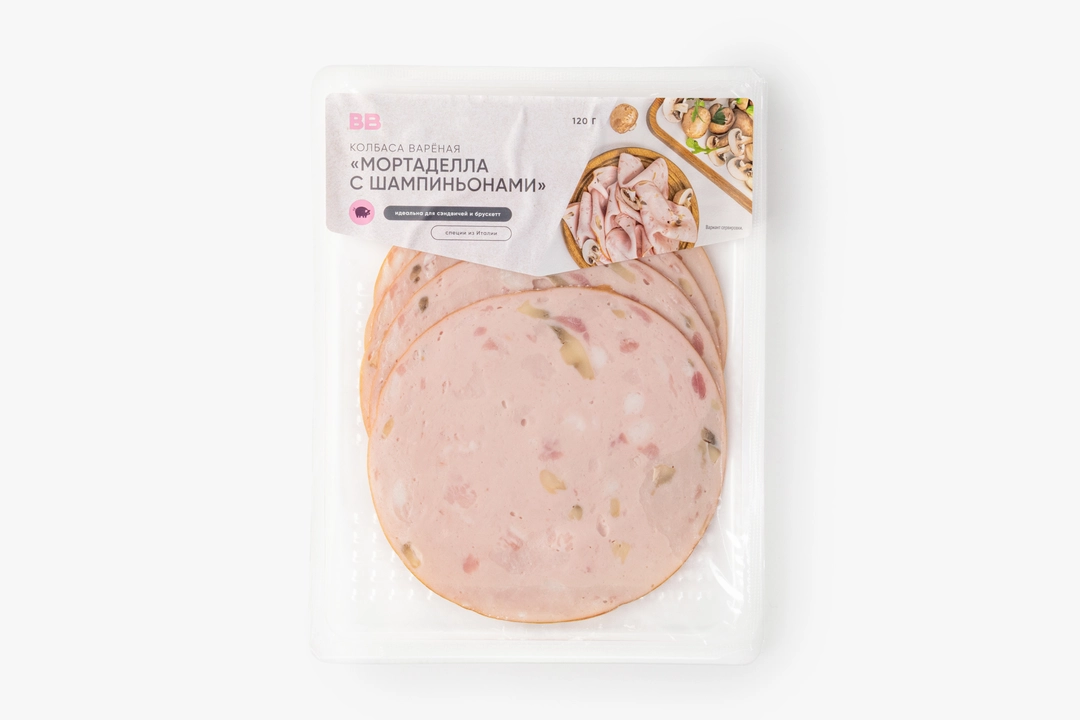 Нежная варёная колбаса с кусочками шампиньонов. Они добавляют нейтральную грибную нотку, не перебивая вкус. Нарезана тонкими ломтиками — удобно использовать для бутербродов, сэндвичей, брускетт или мясной тарелки. Попробуйте дополнить колбасу горчицей или вялеными томатами. Хорошо сочетается со свежим хлебом или листьями салата.