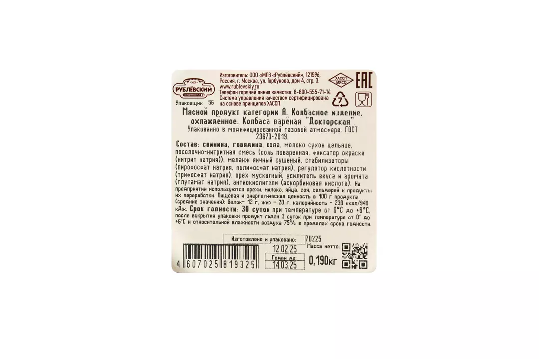 Докторская колбаса, сделанная по стандарту ГОСТ, изготавливается из говядины и свинины, с добавлением сухого молока и специй. Страна-производитель Россия
