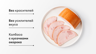 Проверено: без усилителей вкуса. Добавили в колбасу кусочки окорока.