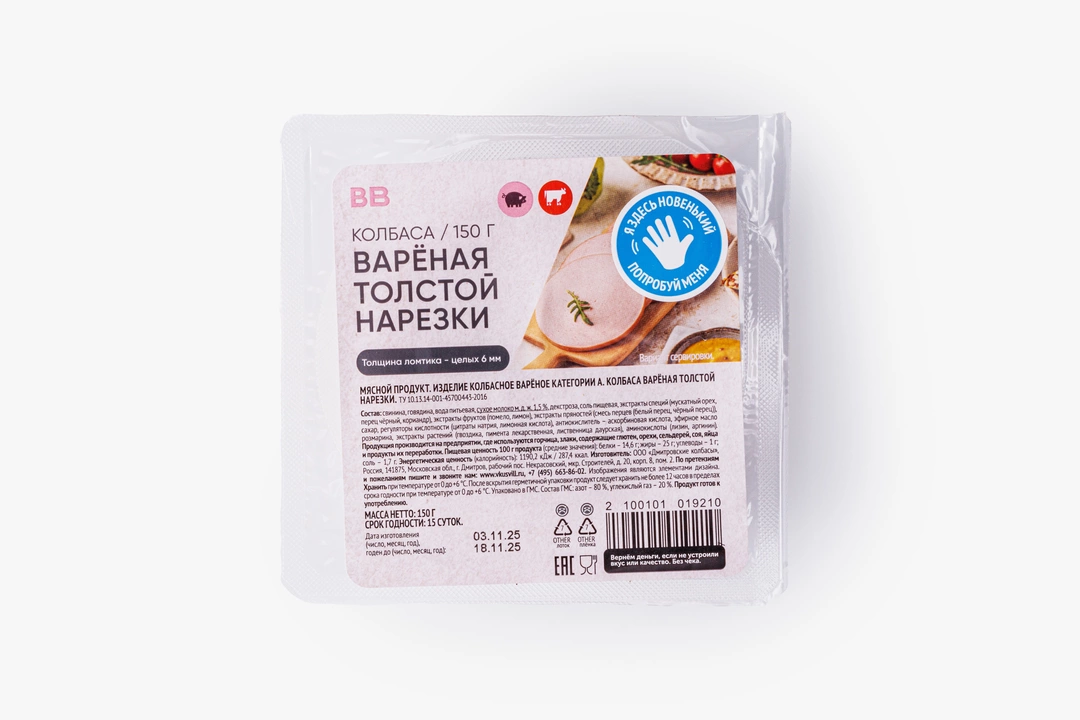 Плотные и ровные ломтики варёной колбасы с мягким, чистым вкусом и гладкой текстурой. Толщина слайсов около 6 мм — щедро, с теплом и любовью, будто их нарезали заботливые руки родителей. Толстые ломтики в «батином стиле» напоминают о детстве и идеально подходят для бутербродов. Они хорошо держат форму и выглядят аппетитно при подаче — универсальный вариант на каждый день.