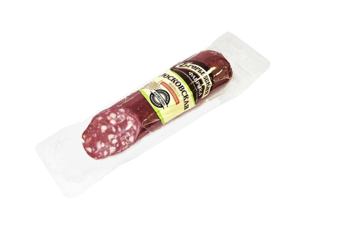 Московская Гост - возглавляет список отечественных в/к колбас. Основа ее состава – высокосортная говядина и довольно крупный шпик, которые и обеспечивают особенный мясной вкус с легким ароматам копчения. Колбасу отличает темно - бордовый цвет фарша, контрастный мозаичный рисунок на срезе и плотная консистенция. Егорьевская колбасно гастрономическая фабрика РОССИЯ
