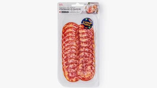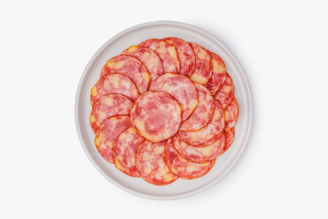 Варёно-копчёная колбаса с аппетитными кусочками сыра внутри — удачный выбор для мясной тарелки. Нежная свинина в сочетании с сыром создаёт интересную текстуру, где сливочные нотки дополняют лёгкий аромат дымка. Подходит для быстрой сервировки — просто дополните хрустящим хлебом, оливками или орехами.