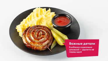 Сочная и пряная колбаска из свинины в компании воздушного пюре. Бережно упакуем в термосумку и привезём блюдо горячим — домой или в офис.Обратите внимание: не забудьте удалить шпажки из колбаски.