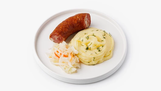 Простое и аппетитное блюдо в традициях сибирской кухни. Мы приготовили толчёную картошку со сливочным маслом так, как это делали наши бабушки. Гарнир дополняет сочная свиная колбаска-каралька с лёгкими нотами чеснока и перца. Квашеная капуста на растительном масле вносит яркую кислинку, а свежий укроп придаёт аромат и свежесть. Такой обед легко собрать на одной тарелке, разогреть и почувствовать теплоту и заботу, с которой он был приготовлен.
