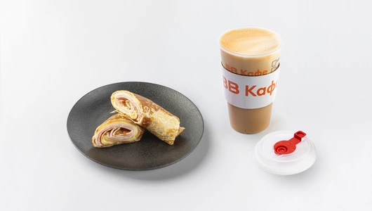 Этот набор для тех, кто не успел позавтракать дома или хочет перекусить в офисе. Горячий капучино с воздушной пенкой приготовлен на основе бленда арабики и робусты. Молочную нежность напитка дополняет плотный блинчик с сытной начинкой. Внутри аппетитная ветчина и голландский сыр с выраженным сливочным вкусом. Мы привезём кофе горячим, а блин слегка подогреем, чтобы он стал ещё более ароматным и вкусным. Комбо удобно взять с собой, если день обещает быть насыщенным.