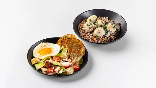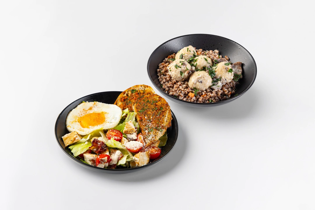 Комбо объединяет два сытных блюда с разным настроением. В салате — тёплое куриное филе с травами, поджаренный бекон и сочные томаты черри на подушке из хрустящих салатных листьев, с соусом с нотками чеснока, пармезана и каперсов. Его дополняют глазунья и золотистая тартинка с брускеттой из вяленых томатов и кешью. Во второй тарелке — нежные куриные шарики, приготовленные на пару, в сливочно-грибном соусе и рассыпчатая гречка с овощами и зеленью. Комбо получается сбалансированным: свежий салат и второе блюдо вместе дают ощущение полноценного обеда.