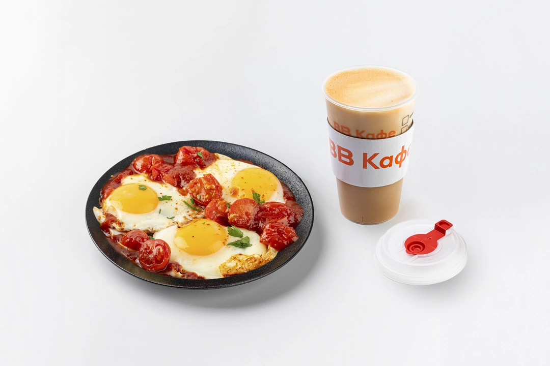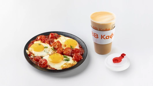 Комбо для плотного завтрака объединяет горячую шакшуку и чашку капучино. В основе блюда — три яйца, приготовленные в пряном томатном соусе с кусочками черри, красным луком и лёгкой остротой халапеньо. Шакшука получается насыщенной, ароматной и сытной, с густым соусом, который хорошо собирается кусочком хлеба. К ней подаётся капучино из бленда арабики и робусты с мягким кофейным вкусом и нежной молочной пенкой. Такое сочетание бодрит, надолго насыщает и подойдёт тем, кто любит начинать день с горячей еды и кофе.