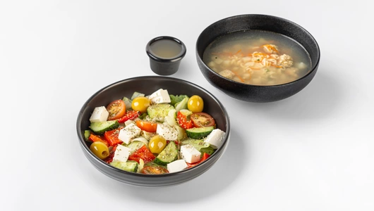 Комбо: Суп куриный с фрикадельками + Салат Греческий с томатами