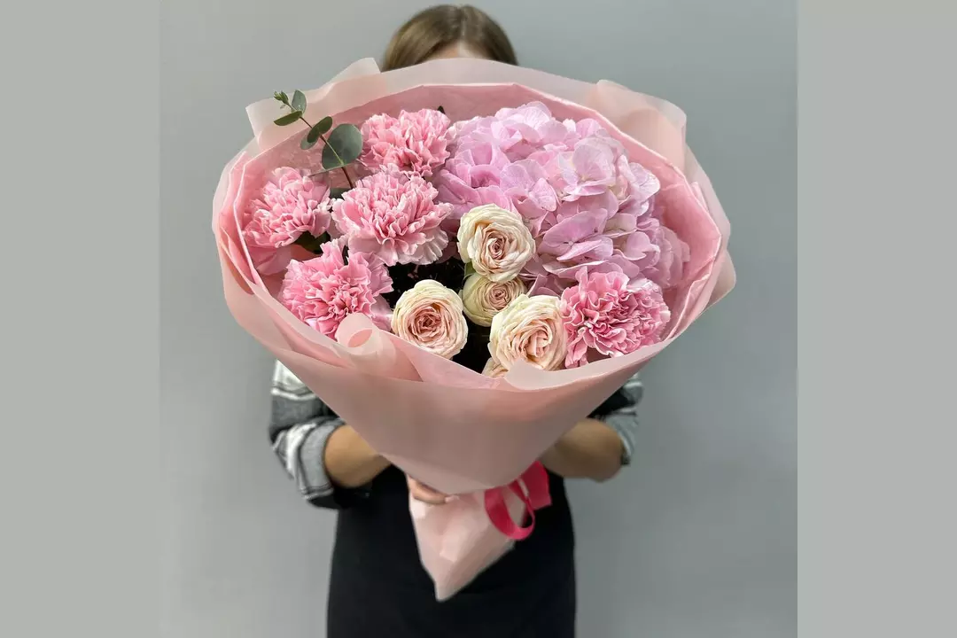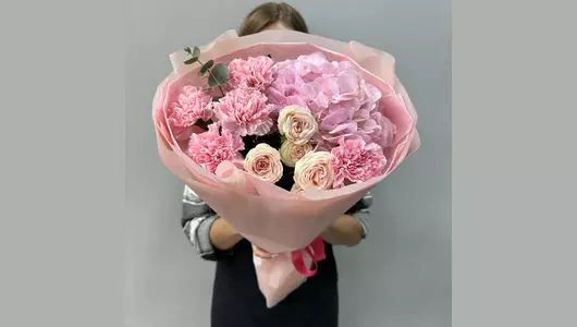 Состав Гортензия - 1 шт. Писташ - 1 шт. Эвкалипт - 1 шт. Лента атласная - 1 шт. Роза кустовая пионовидная - 1 шт. Диантус розовый - 5 шт. Упаковка матовая - 5 шт. Скрыть Размер Ширина - 30 см Высота - 55 см