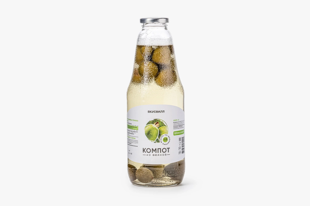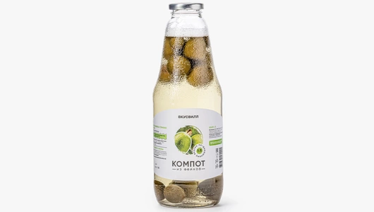 Кисло-сладкий компот с кусочками фейхоа. Обладает насыщенным вкусом этих экзотических плодов. Хорошо утоляет жажду.