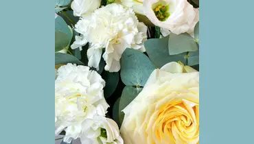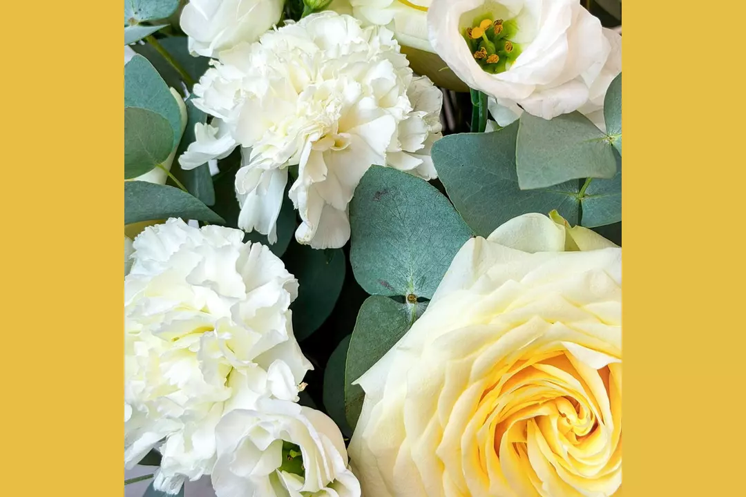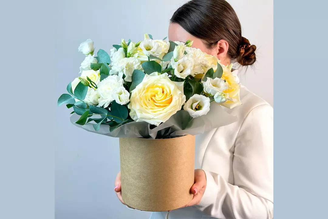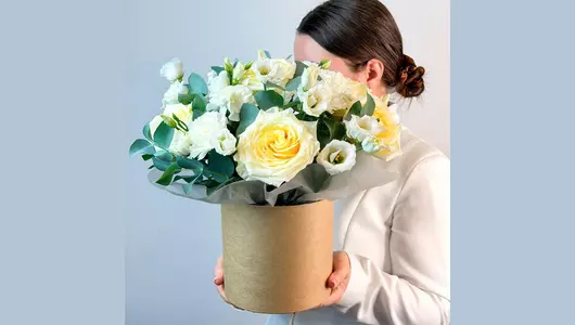 Композиция в коробке с кремовыми розами, гвоздиками и лизиантусом "Ванильный десерт" FMART by flowwow
