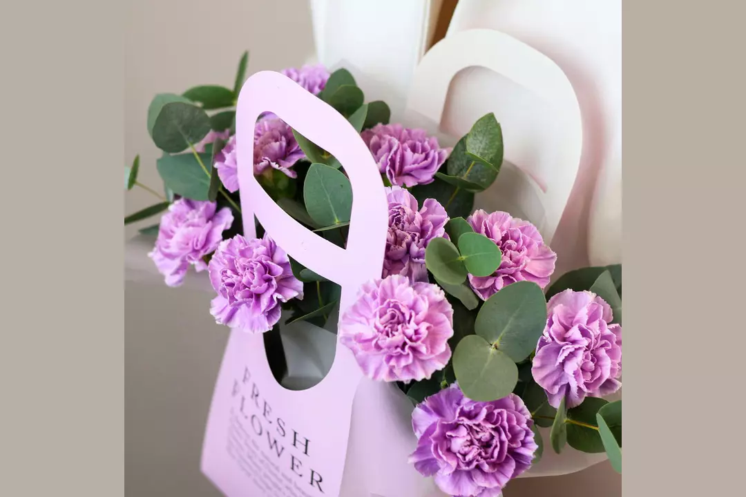 Композиция в сумочке "Лавандовые поля" из 11 диантусов с эвкалиптом FMART by flowwow