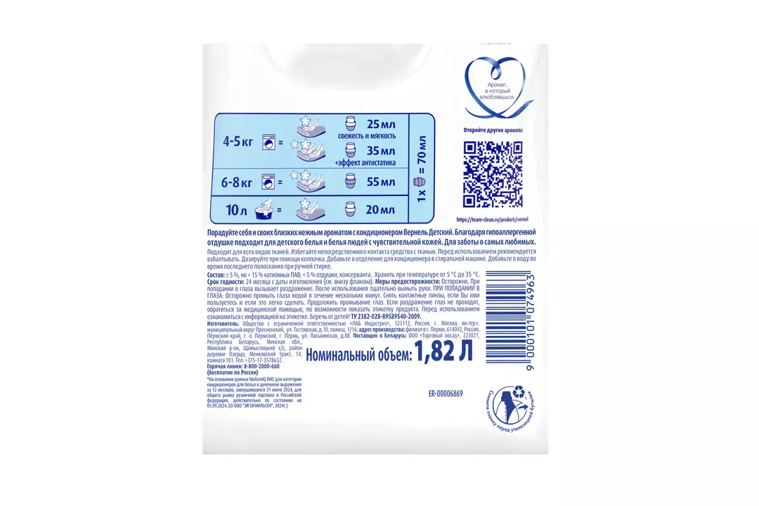 Кондиционер для белья Вернель Детский – это идеальное решение для бережного ухода за одеждой самых маленьких членов вашей семьи! Специально разработанный для детского белья этот кондиционер подходит как для машинной так и для ручной стирки обеспечивая невероятную мягкость и комфорт для нежной кожи ребенка. -Благодаря концентрированной формуле, ваше белье становится не только мягким, но и легким в уходе. -Аромакапсулы вплетенные в волокна ткани, обеспечивают приятный нейтральный запах который сохраняется на протяжении долгого времени, даря ощущение свежести и уюта. -Обладает антистатическим эффектом что делает его идеальным для всех типов тканей, включая самые деликатные. -Облегчает глажку превращая этот процесс в удовольствие, и дарит вашей одежде невероятную мягкость которая ощущается с первого прикосновения. -Гипоаллергенный состав делает его безопасным для всей семьи, включая людей с чувствительной кожей и склонных к аллергии. Позвольте себе ощутить мягкость и аромат высочайшего качества, который превратит вашу одежду в произведение искусства. Вернель Детский – это не просто кондиционер, это атмосфера заботы в каждой детали вашей жизни! Производитель ООО ЛАБ Индастриз. Страна производитель-Россия