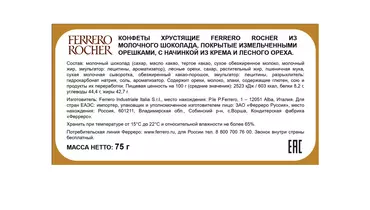 Что мы ценим больше всего в жизни? Время, проведенное со своей семьей, любовь, настоящую дружбу, - чувства, которые мы испытываем, когда близкие люди рядом. Такие моменты заслуживают того, чтобы их отпраздновали по-особенному, потому что минуты радости становятся еще более запоминающимися вместе с Ferrero Rocher. Ferrero Rocher - тем, кто значим. Откройте для себя восхитительное сочетание обжаренных лесных орехов в нежном молочном шоколаде и хрустящих вафель. Набор из 6 бесподобных конфет — идеальный выбор, чтобы побаловать себя или разделить момент с близкими. Ferrero Rocher - это шедевр вкуса, наполняющий блаженством каждое мгновение. Страна производитель-Италия