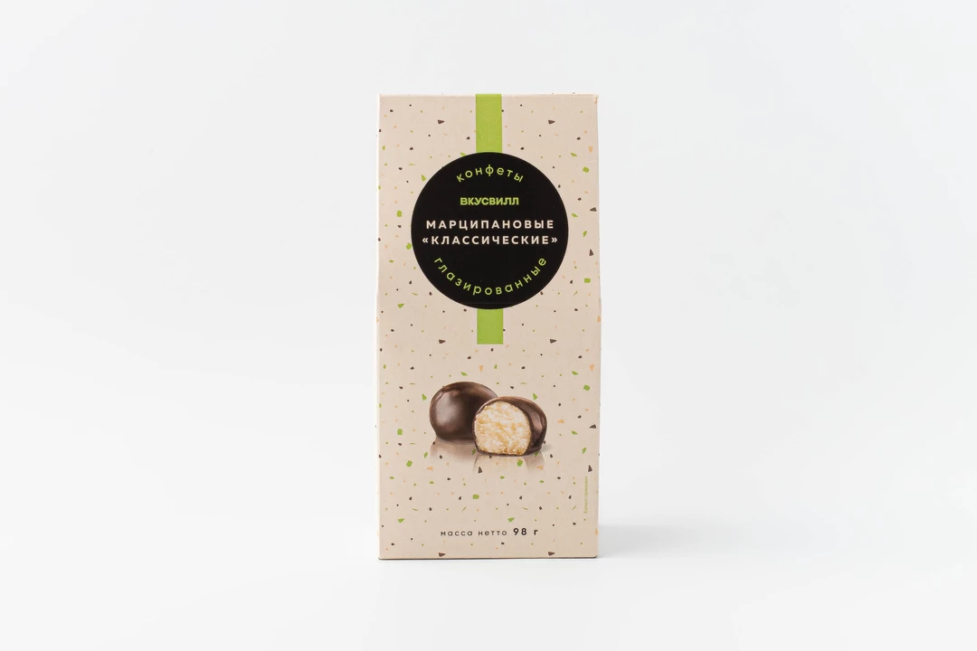 Нежные конфеты из миндального марципана, глазированные тёмным шоколадом. Умеренно сладкие, с бархатистой текстурой, они отлично дополнят чаепитие. Каждая конфета упакована в отдельную обёртку, поэтому несколько штук всегда можно взять с собой, чтобы полакомиться в дороге. А ещё элегантную коробочку можно преподнести в качестве подарка.