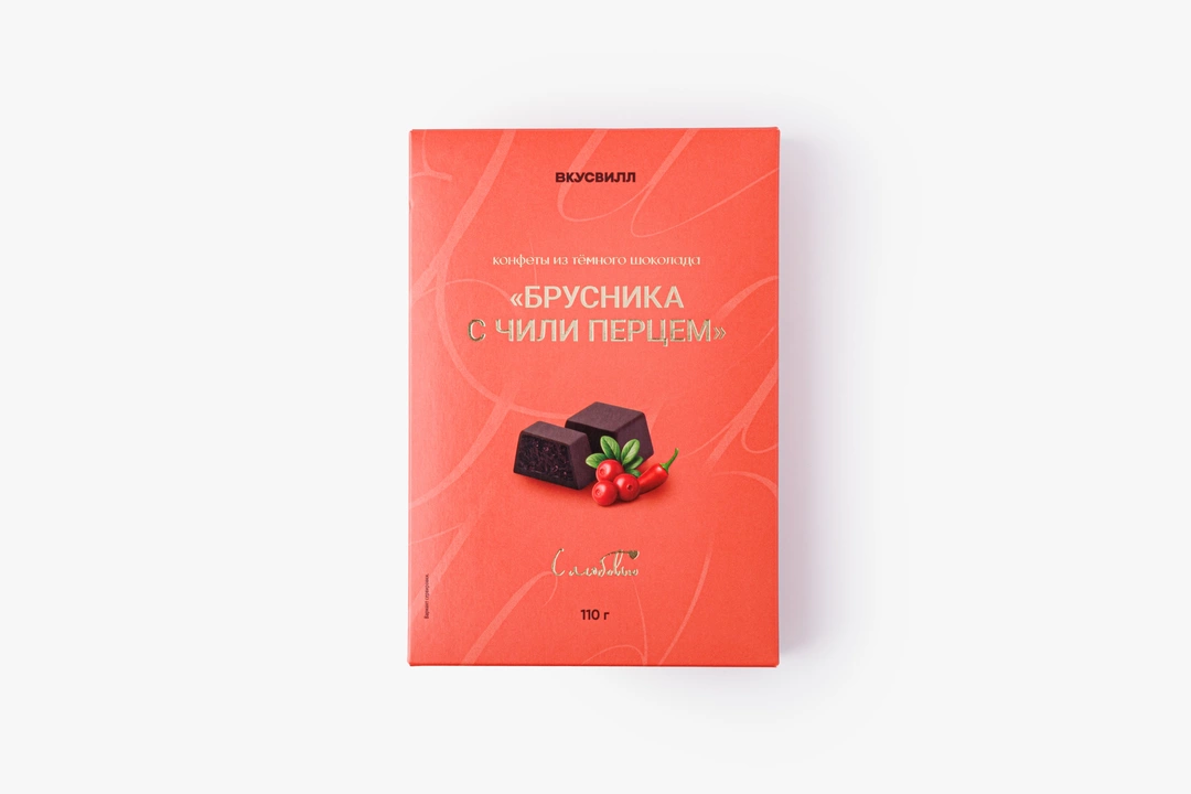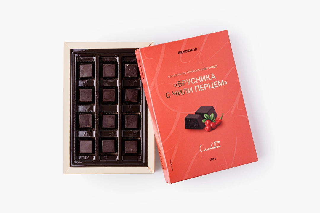 Конфеты из тёмного шоколада с природной терпкостью брусники и лёгкой пряностью чили. Вкус у них необычный, кисловато-острый. Молотый перец вносит мягкие тёплые ноты, раскрывающиеся постепенно после первого ягодного впечатления. Такой десерт хорошо сочетается с чаем или кофе. Лакомство оценят любители оригинальных вкусовых комбинаций.