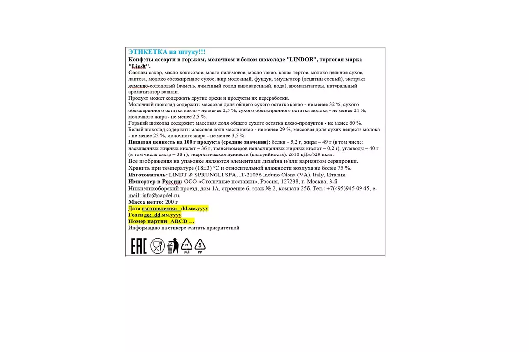 Шоколадные конфеты Линдор Ассорти 200 гр – это изысканный набор, который станет идеальным подарком для ценителей сладостей. В каждой коробке вы найдете разнообразие вкусов, которые порадуют даже самых требовательных гурманов. Конфета Lindor – это не просто сладость, а настоящее произведение искусства в мире шоколада. Каждая конфетка скрывает в себе нежнейшую кремовую начинку, которая тает во рту и дарит незабываемое удовольствие. Шоколадный слой может быть белым, молочным или темным, а также молочным с добавлением измельченного лесного ореха. Такой ассортимент позволяет выбрать именно тот вкус, который вам по душе. Этот подарочный набор упакован в элегантную коробку, что делает его отличным выбором для любого торжества или праздника. Подарок из таких конфет будет уместен как на день рождения близкого человека, так и на корпоративное мероприятие. Шоколадные конфеты Lindor известны своим утонченным вкусом и высоким качеством ингредиентов. Они станут прекрасным дополнением к вашему чаепитию или кофе-паузе. Сладкий аромат шоколада наполняет атмосферу уютом и теплом. Подарочная упаковка набора подчеркивает его статусность и делает его желанным презентом для многих людей по всему миру. Это не просто сладости – это символ внимания и заботы о близких людях. В каждой коробке вы найдете разнообразие вкусовых сочетаний: от классического молочного до насыщенного темного шоколада с орехами. Такой подарок обязательно вызовет улыбку на лице получателя и оставит приятные воспоминания о вашем внимании. Страна-производитель Италия