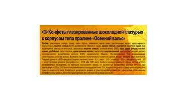 Конфеты Осенний вальс – это любимые многими сладости от российской компании «Рот-Фронт». Десерт имеет форму купола, покрытого нежной шоколадной глазурью, вершина которого изготовлена из цельного ядра фундука. Начинка состоит из пралине и молотого дробленого арахиса. Благодаря изысканной смеси ингредиентов в четко рассчитанных пропорциях, конфеты имеют необычайно нежный и запоминающийся вкус, который придется по душе всем ценителям сладкого. Продукт можно употреблять со всеми любимыми видами напитков, особенно с чаем и кофе. Благодаря своей привлекательной упаковке конфеты станут прекрасным подарком. Правообладатель торговой марки ОАО «Рот Фронт». Маркировка на упаковке соответствует предприятию-изготовителю R или N -ОАО «Рот Фронт», B - ОАО Кондитерский концерн Бабаевский Страна-производитель Россия