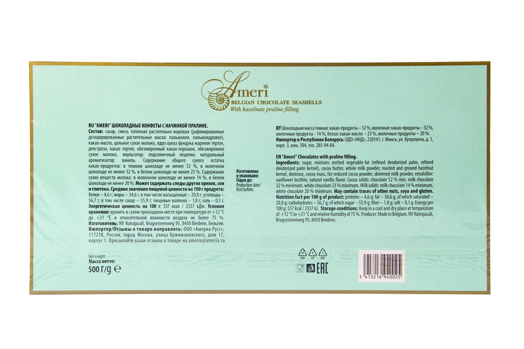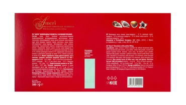 Торговая марка Амери, производящая изысканный сладкий ассортимент, знакома всем любителям темного шоколада. Все гурманы десертов и убежденные сладкоежки знают и любят продукцию Амери. Кондитерская фабрика создает шоколад, который можно по праву отнести к продукции премиального сегмента. Настоящие шоколадки от Амери не только вкусные, но также очень красивые. Выглядят настолько привлекательно, что достойны украсить роскошный праздничный стол. Рецептуры, по которым производятся эти сладости - уникальна. Каждый рецепт разрабатывается силами своих технологов и может служить визитной карточкой кондитерского предприятия. С большим вниманием сотрудники компании относятся к разработке вкусов. Основываясь на изучении потребительских предпочтений и последних тенденциях сладкого рынка, они создают новые продукты, в которых удачно сочетаются инновации и традиции. Страна-производитель Бельгия