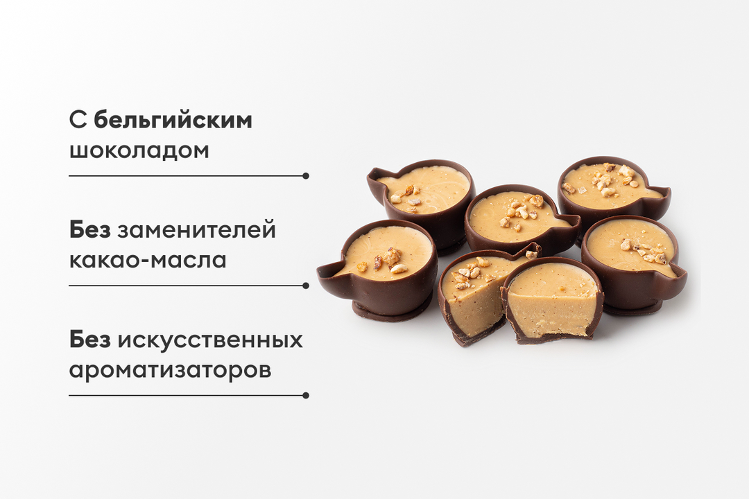 Конфеты с бельгийским шоколадом в оригинальной форме изысканных чашечек. Состав проверен: нет заменителей какао-масла и искусственных ароматизаторов