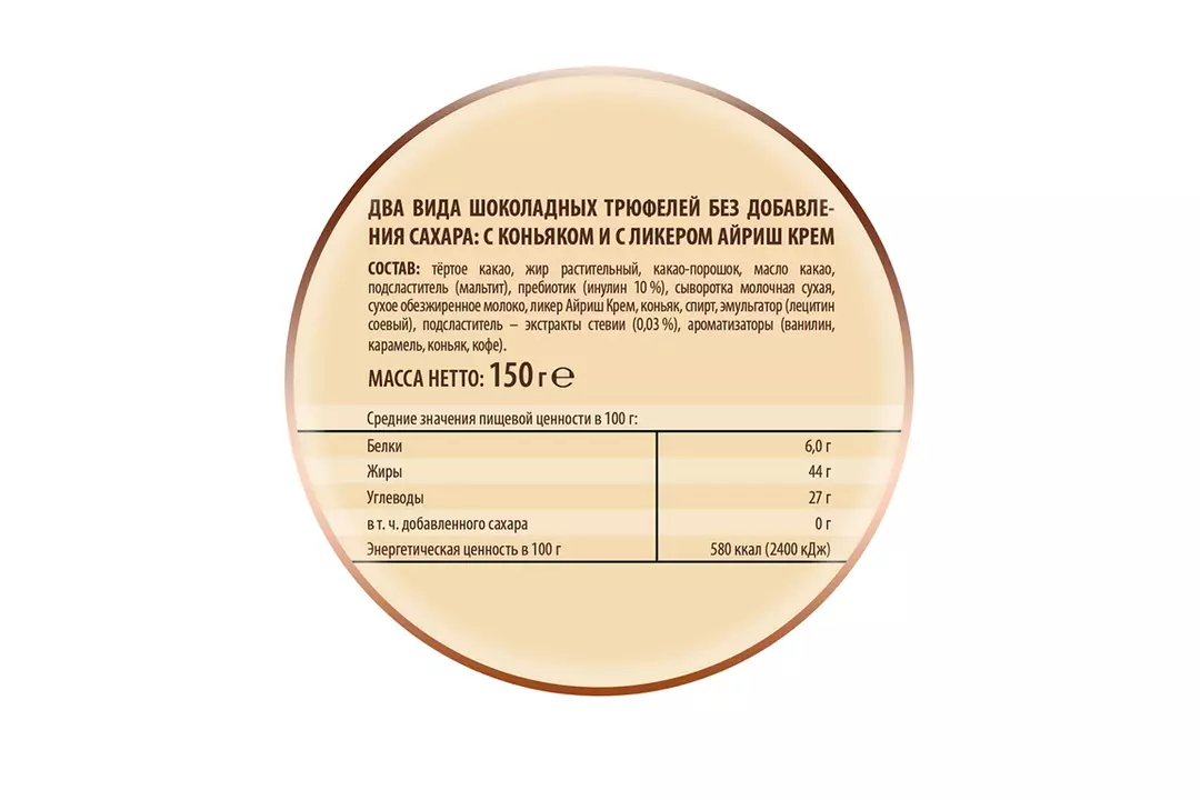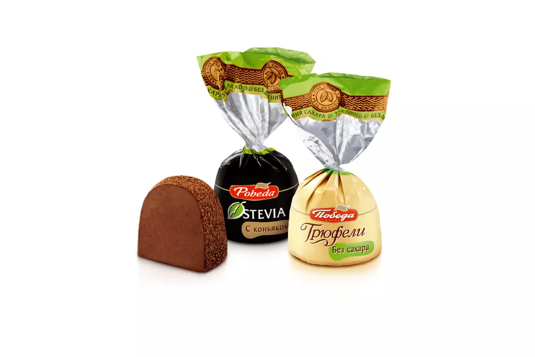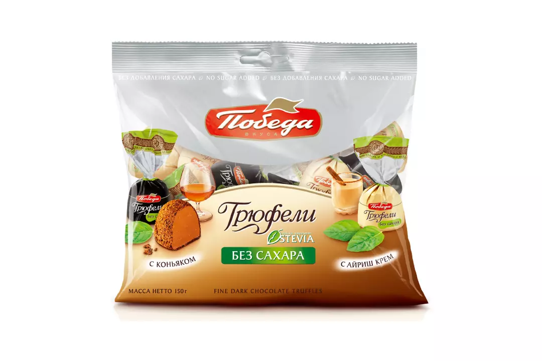 Трюфели шоколадные без сахара, с коньяком и с ликером айриш крем (два вида). В основе каждой конфеты — нежнейшее «сердце» из шоколада и сливок. Трюфели посыпаны ароматным темным какао. Сахар заменен на натуральный подсластитель — экстракт стевии, «медовой травы». Стевия по вкусу гораздо слаще сахара, при этом в ней полностью отсутствует сам сахар. Трюфели со стевией менее калорийны по сравнению с классическим аналогом. Продукт идеально подходит для тех, кто следит за питанием и фигурой, для беременных и кормящих женщин а также для диабетиков. В трюфеле без сахара «Победа Вкуса» содержится инулин — природный полисахарид пребиотик, который регулирует работу желудочно-кишечного тракта и укрепляет иммунитет. Его величество шоколадный трюфель. Эта изысканная конфета с легкой горчинкой по праву считается королевским десертом. Перед нами трюфели, созданные по классическому рецепту, с нежным сердцем из шоколадного крема и свежих сливок, с добавлением ароматного коньяка и посыпанные темным какао. Но вместо сахара в рецепте использован натуральный подсластитель – экстракт стевии. Выбирайте классические трюфели нового поколения – где вкус и польза идеально дополняют друг друга.