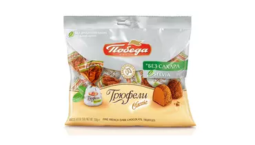 В основе каждой конфеты — нежнейшее «сердце» из шоколада и сливок. Трюфели посыпаны ароматным темным какао. Сахар заменен на натуральный подсластитель — экстракт стевии, «медовой травы». Стевия по вкусу гораздо слаще сахара, при этом в ней полностью отсутствует сам сахар. Трюфели со стевией менее калорийны по сравнению с классическим аналогом. Продукт идеально подходит для тех, кто следит за питанием и фигурой, для беременных и кормящих женщин а также для диабетиков. В трюфеле без сахара «Победа Вкуса» содержится инулин — природный полисахарид пребиотик, который регулирует работу желудочно-кишечного тракта и укрепляет иммунитет.