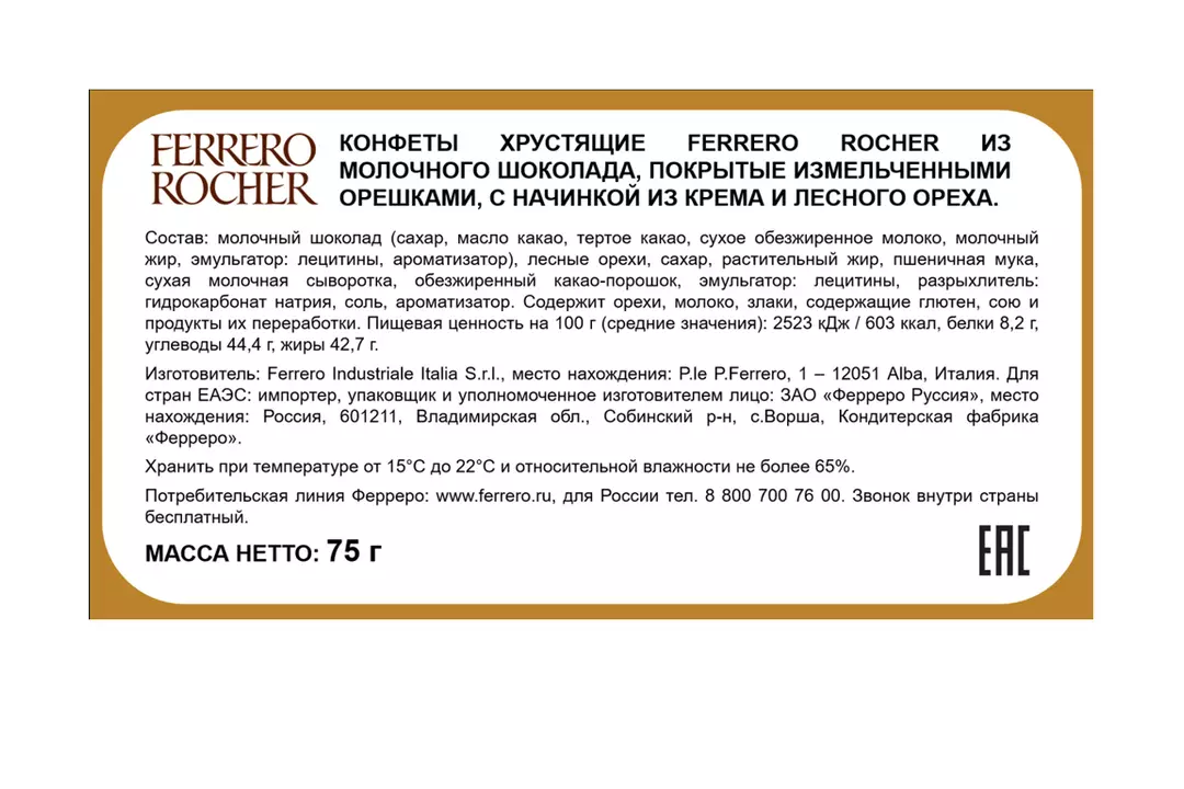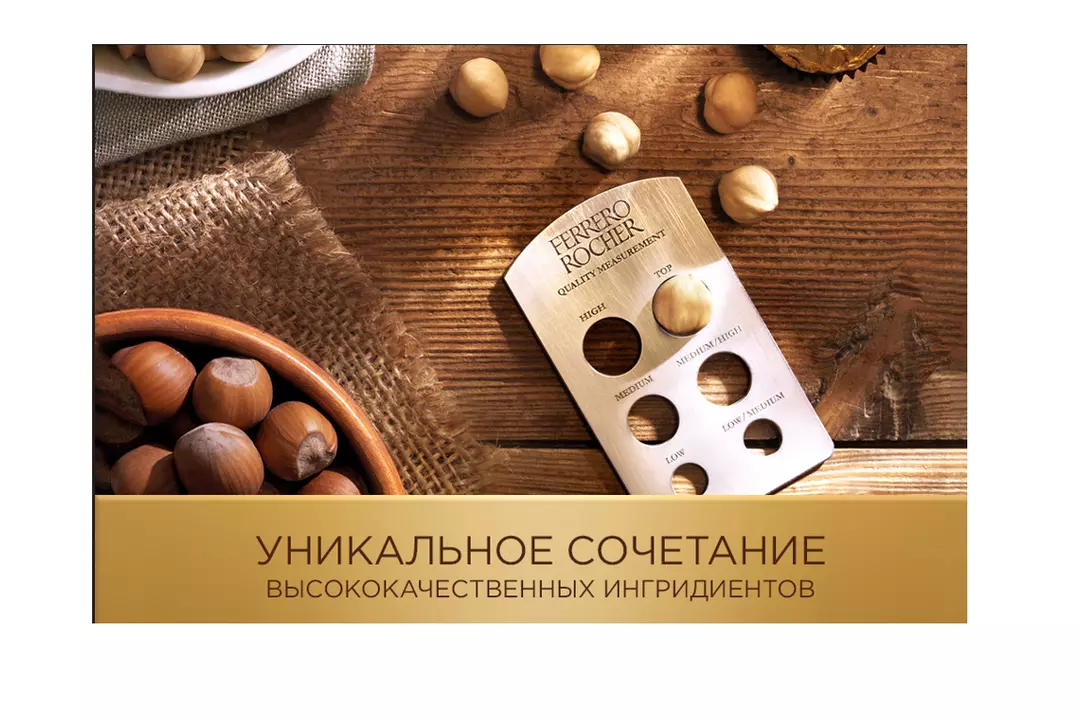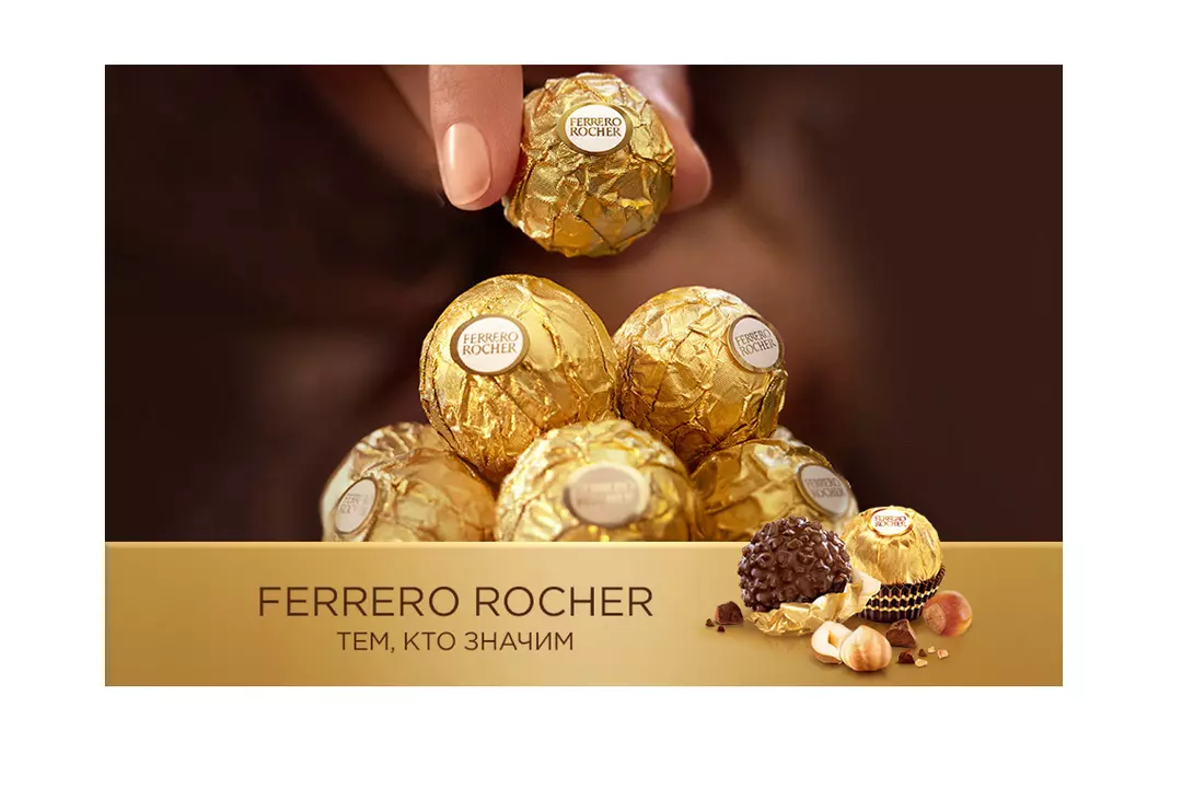 Что мы ценим больше всего в жизни? Время, проведенное со своей семьей, любовь, настоящую дружбу, - чувства, которые мы испытываем, когда близкие люди рядом. Такие моменты заслуживают того, чтобы их отпраздновали по-особенному, потому что минуты радости становятся еще более запоминающимися вместе с Ferrero Rocher. Ferrero Rocher - тем, кто значим. Откройте для себя восхитительное сочетание обжаренных лесных орехов в нежном молочном шоколаде и хрустящих вафель. Набор из 6 бесподобных конфет — идеальный выбор, чтобы побаловать себя или разделить момент с близкими. Ferrero Rocher - это шедевр вкуса, наполняющий блаженством каждое мгновение. Страна производитель-Италия