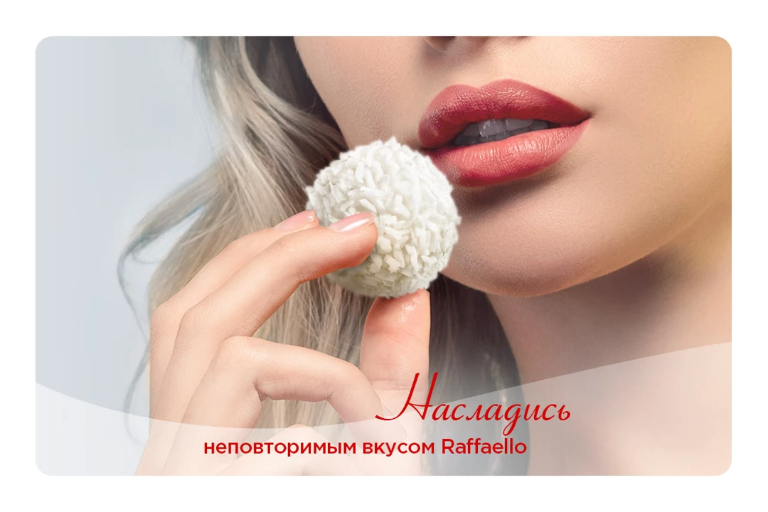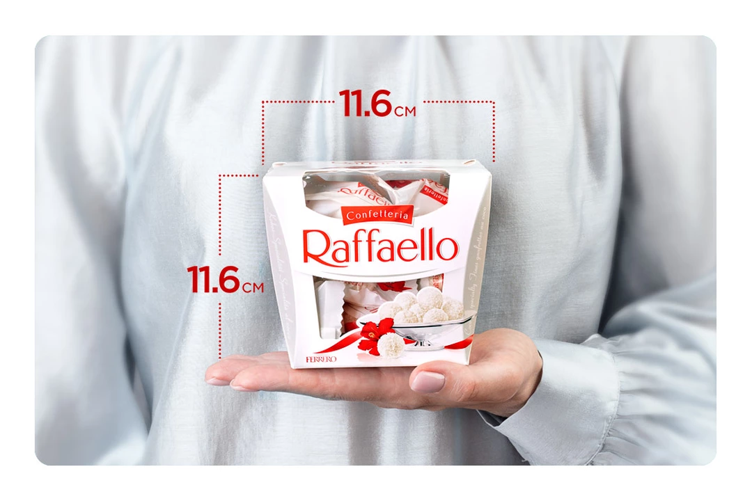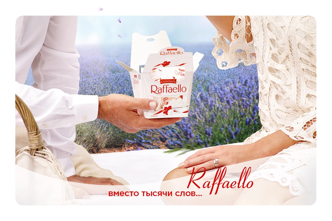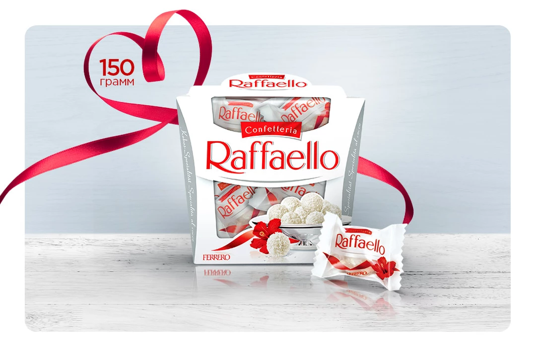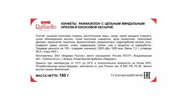 Raffaello - любовь в каждом моменте! Каждый момент может стать поводом выразить свою любовь и привязанность. Raffaello - это идеальный способ дать понять вашим близким, как много они для вас значат, ведь каждый момент с Raffaello становится особенным. Конфеты Raffaello - лучший подарок для вашего любимого человека. Уникальный вкус Raffaello - это незабываемые впечатления, которыми можно насладиться в кругу близких или просто весело провести время. Белый хрустящий миндаль, покрытый бархатистой кремовой начинкой и посыпанный нежной кокосовой стружкой придает непередаваемую нежность вкусу. • Легендарная упаковка Raffaello 150 г: для Вас и Ваших близких. • Конфеты в подарок; • Отборный кокосовый орех; • Подходит на перекус; • Конфеты с миндалем, кокосовая обсыпка; • Лучший подарок на праздник. В условиях хранения указать - Хранить при температуре от 15.0 °С до 22.0 °С и относительной влажности не более 65%. Страна производитель-Россия