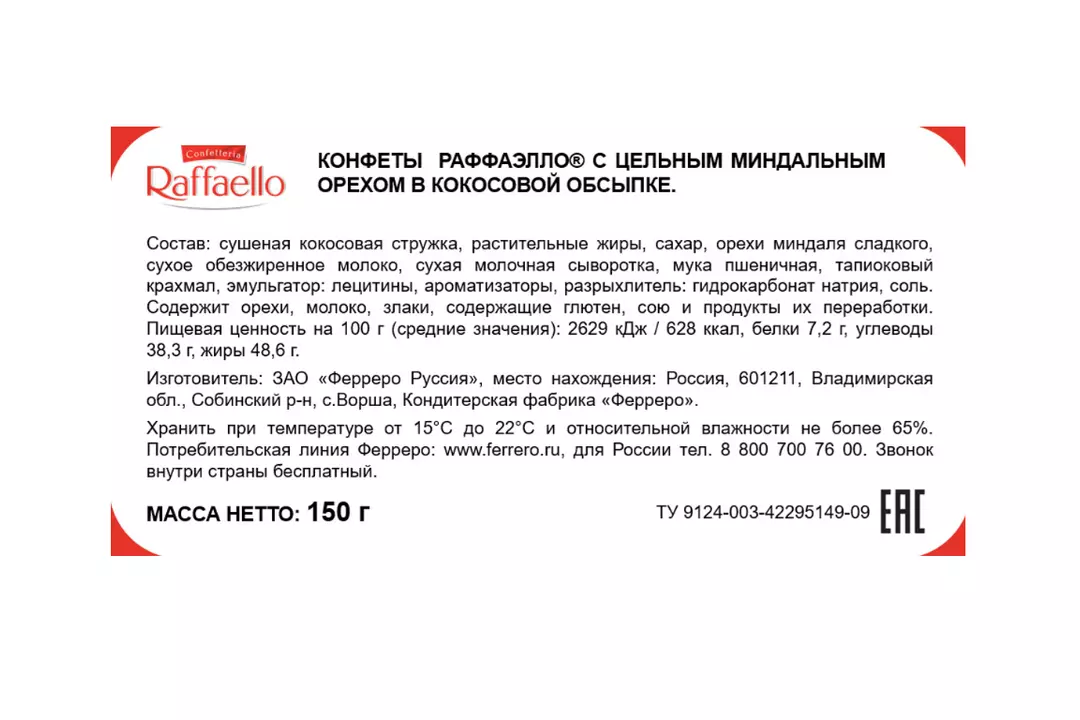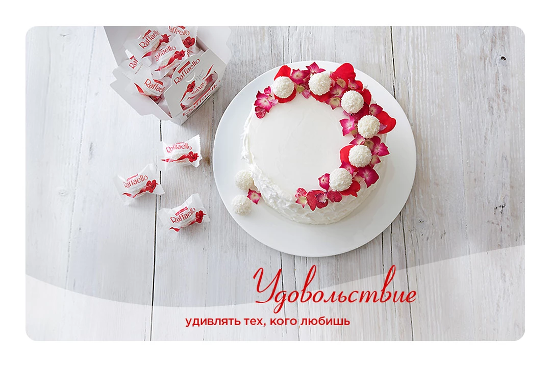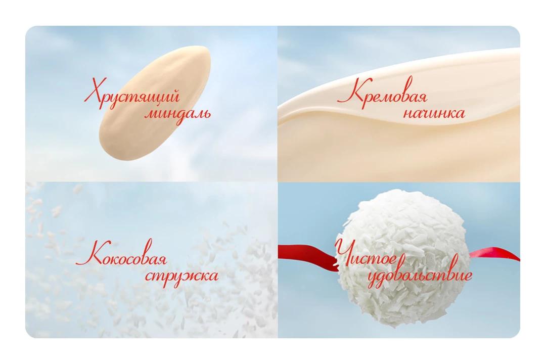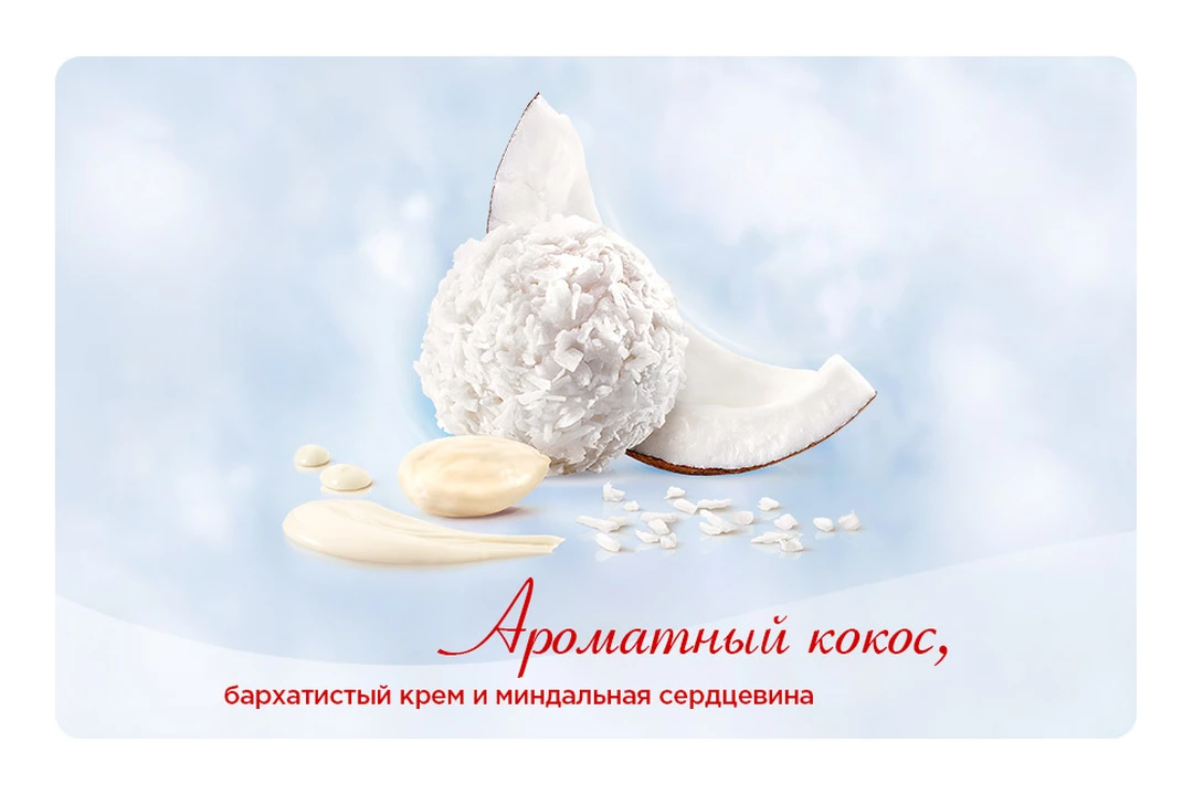 Raffaello - любовь в каждом моменте! Каждый момент может стать поводом выразить свою любовь и привязанность. Raffaello - это идеальный способ дать понять вашим близким, как много они для вас значат, ведь каждый момент с Raffaello становится особенным. Конфеты Raffaello - лучший подарок для вашего любимого человека. Уникальный вкус Raffaello - это незабываемые впечатления, которыми можно насладиться в кругу близких или просто весело провести время. Белый хрустящий миндаль, покрытый бархатистой кремовой начинкой и посыпанный нежной кокосовой стружкой придает непередаваемую нежность вкусу. • Легендарная упаковка Raffaello 150 г: для Вас и Ваших близких. • Конфеты в подарок; • Отборный кокосовый орех; • Подходит на перекус; • Конфеты с миндалем, кокосовая обсыпка; • Лучший подарок на праздник. В условиях хранения указать - Хранить при температуре от 15.0 °С до 22.0 °С и относительной влажности не более 65%. Страна производитель-Россия