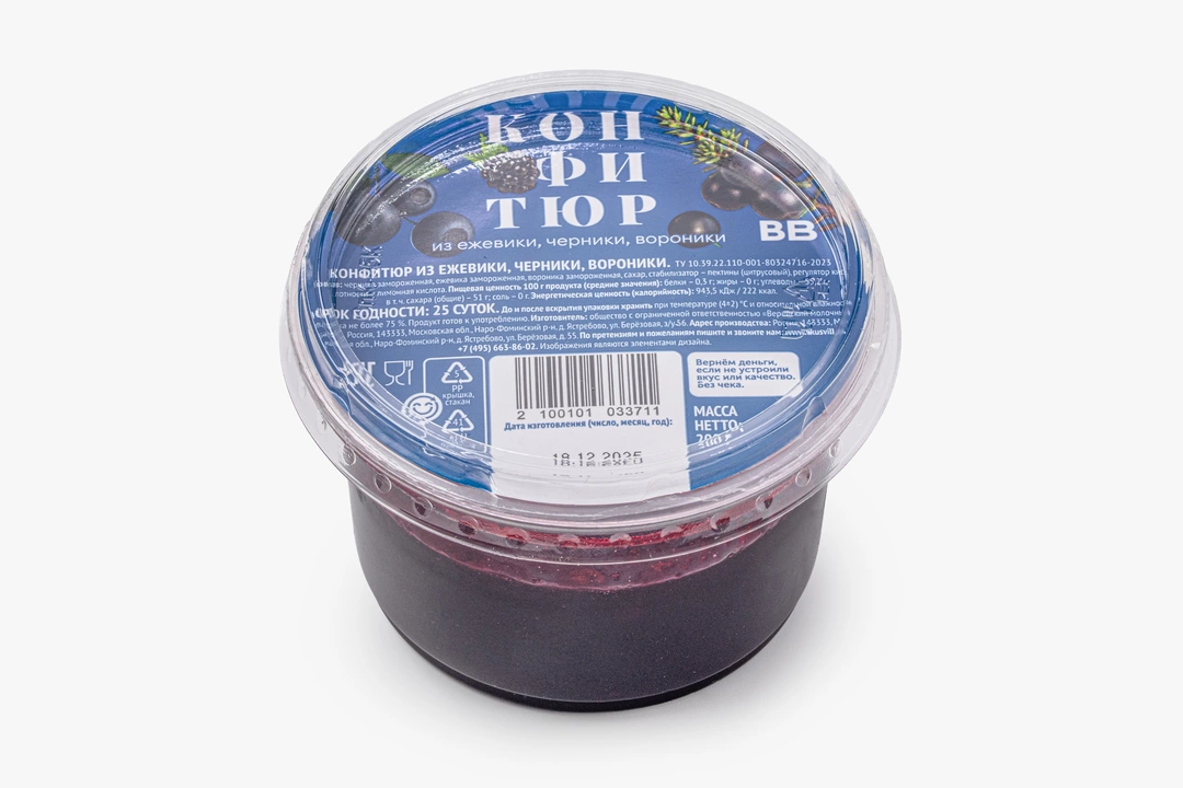 Ягодный конфитюр с глубоким вкусом. Черника даёт мягкую сладость, ежевика добавляет лёгкую терпкость, а вороника — кислую нотку и характерный лесной аромат. Текстура получается густой и однородной, конфитюр удобно намазывать на тосты и добавлять в выпечку. Он хорошо сочетается с творогом, йогуртом и мягкими сырами, а также подойдёт для прослойки десертов или подачи к блинам и сырникам.