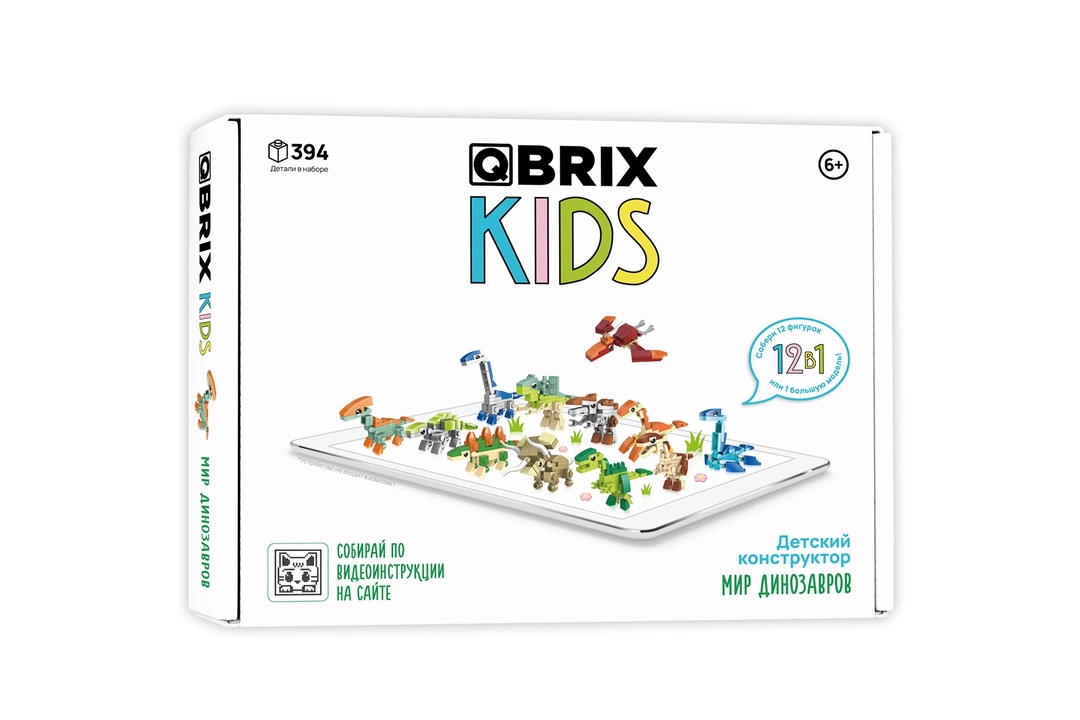 QBRIX KIDS — серия ярких детских конструкторов о мире животных, роботах, машинках и не только. В наборе «Мир динозавров» ребёнка ждут: Плезиозавр, Анкилозавр, Трицератопс, Стегозавр, Брахиозавр, Паразауролоф, Дилофозавр, Велоцираптор, Теризинозавр, Птерозавр, Спинозавр, Тираннозавр и Большой Тираннозавр Рекс. Ребёнок может собрать либо 12 маленьких животных, либо 1 большого с помощью понятной видеоинструкции с интересными фактами о каждом из них. Видеоинструкции можно смотреть с любого устройства: телефона, планшета или компьютера. Также в каждый набор вложены бумажные инструкции с понятными схемами сборки. Конструктор изготовлен из качественного ABS пластика, поэтому совершенно безопасен для детей. Страна-производитель Китай