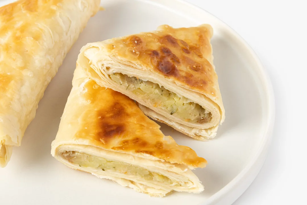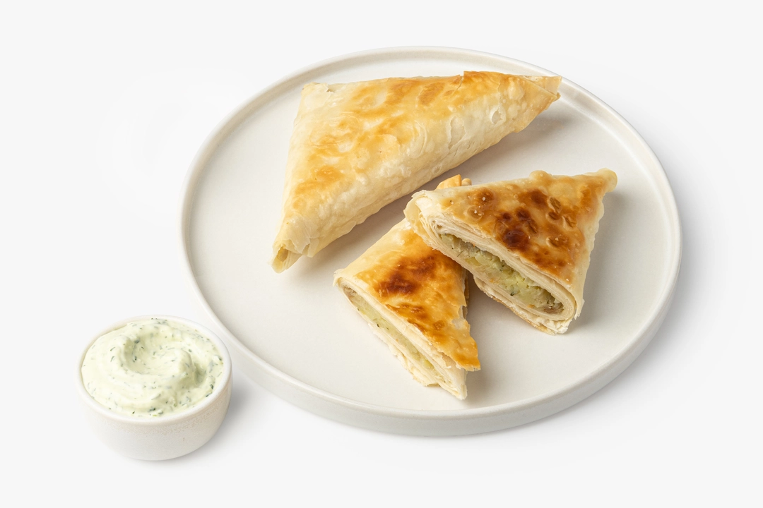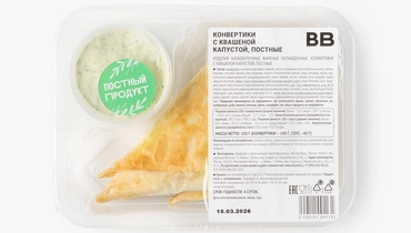 Конвертики из лаваша с начинкой из квашеной и свежей капусты, картофеля и укропа. Обжарены до лёгкой румяности. В отдельном соуснике — постный майонез с укропом и чесноком на основе горохового белка и горчичного масла. В составе нет ингредиентов животного происхождения. В упаковке 2 штуки