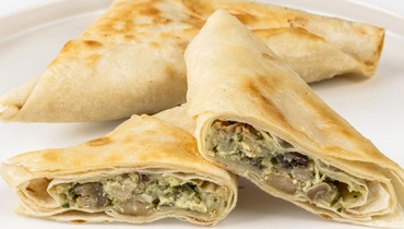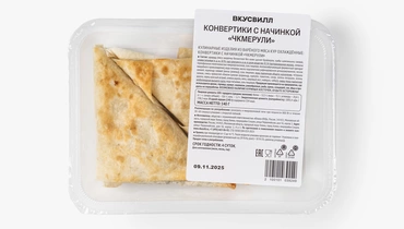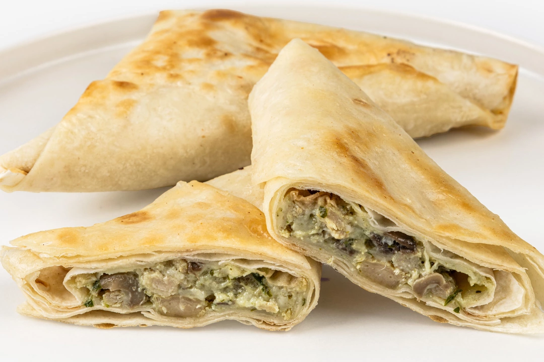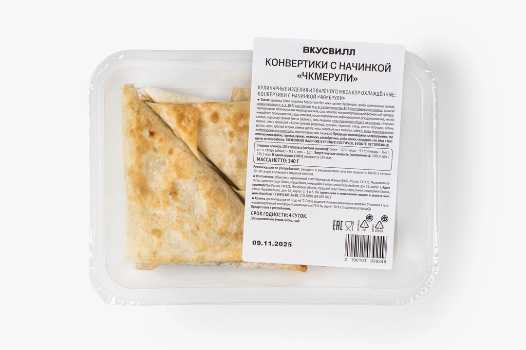 Готовые конвертики в лаваше с куриной начинкой. Курица смешана со сливочным соусом, чесноком, шампиньонами и сулугуни, поэтому начинка получается плотной и однородной. Зелень и хмели-сунели добавляют характерный грузинский акцент. Перед подачей конвертики можно слегка разогреть.