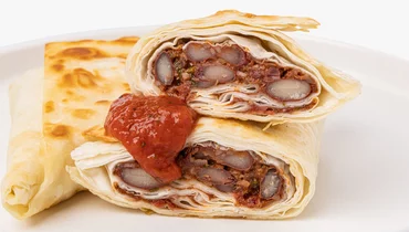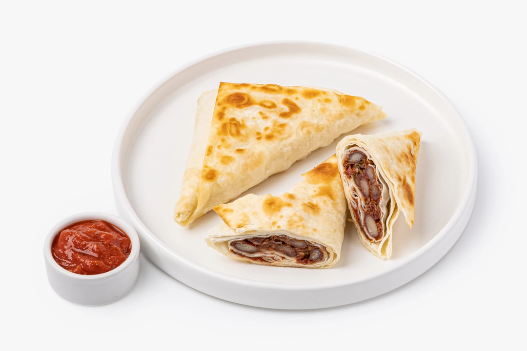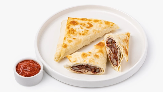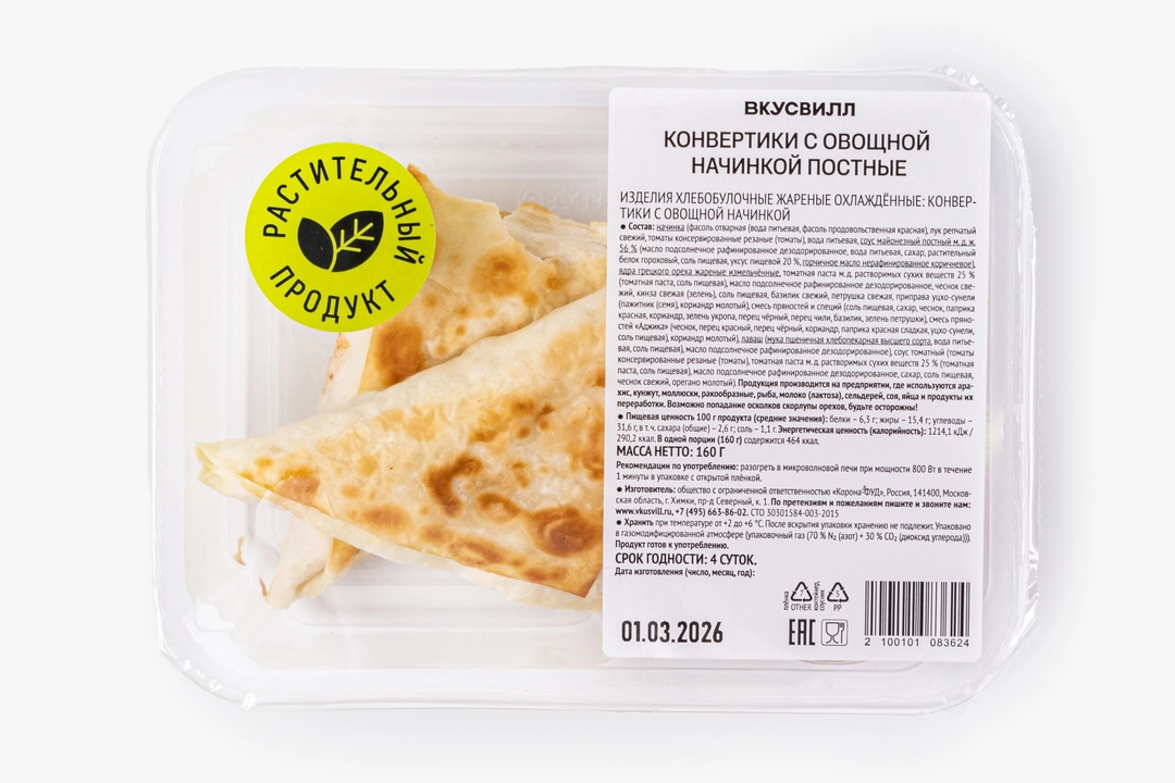 Конвертики из пшеничного лаваша с начинкой из отварной фасоли и консервированных томатов с добавлением свежего лука, специй и грецкого ореха. Овощи заправлены постным майонезом. В отдельный контейнер упакован томатный соус. В упаковке 2 конвертика.