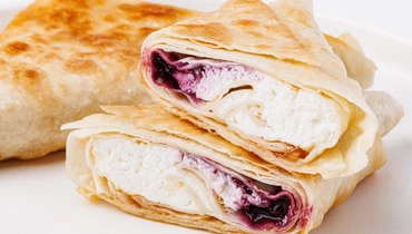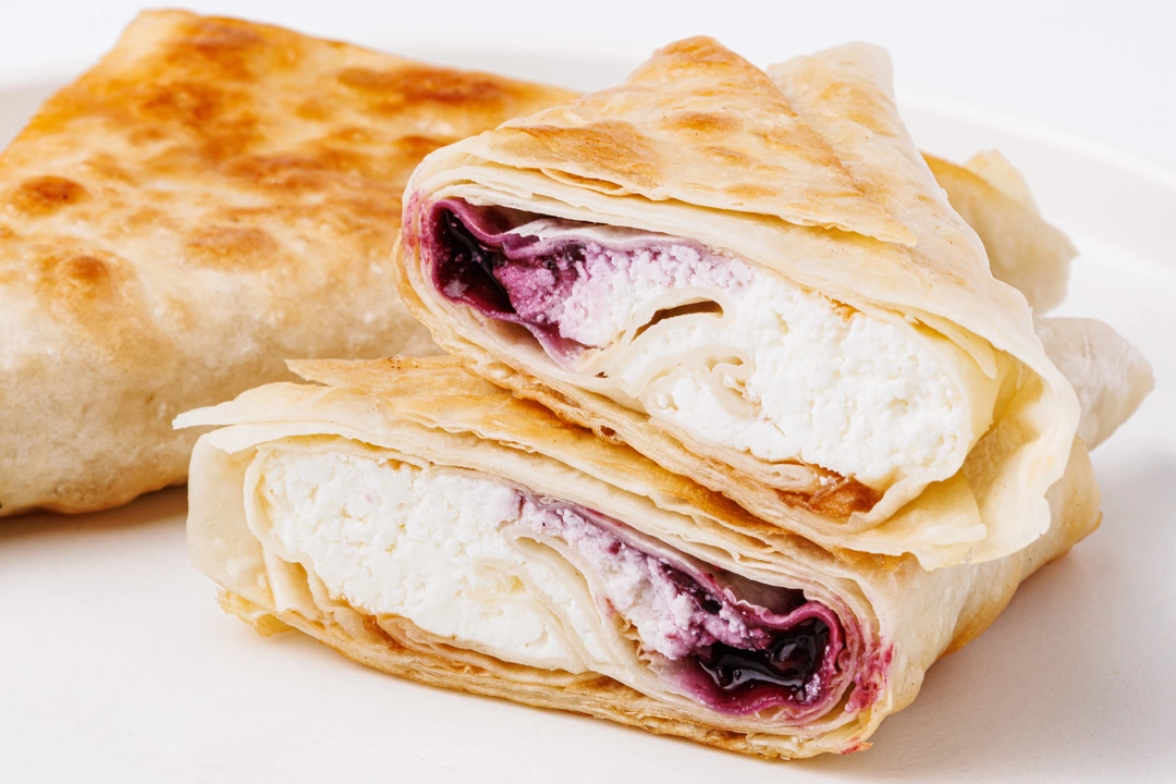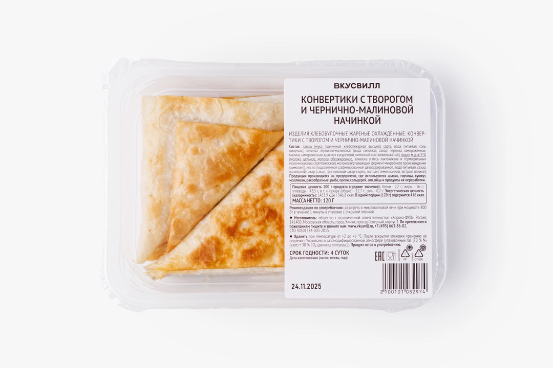 Конвертики из лаваша с творогом и чернично-малиновой начинкой. Мягкий творог с ванильным сахаром сочетается с ягодным наполнителем. Обжарены до лёгкой корочки.