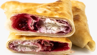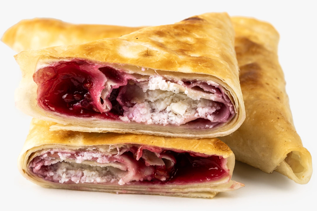 Треугольные конвертики из тонкого лаваша с творожной и малиновой начинкой. Внутри нежный творог и ягодный соус с лёгкой кислинкой, снаружи — румяная хрустящая корочка.