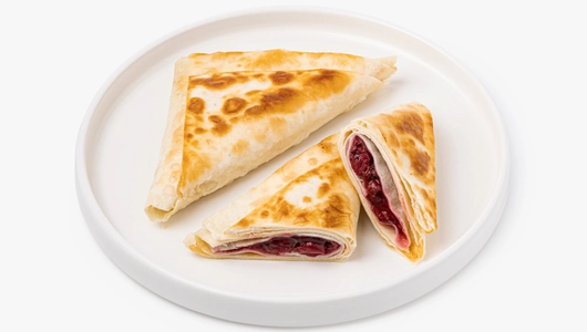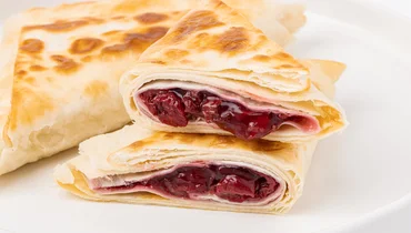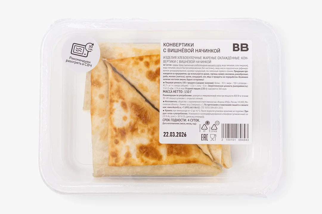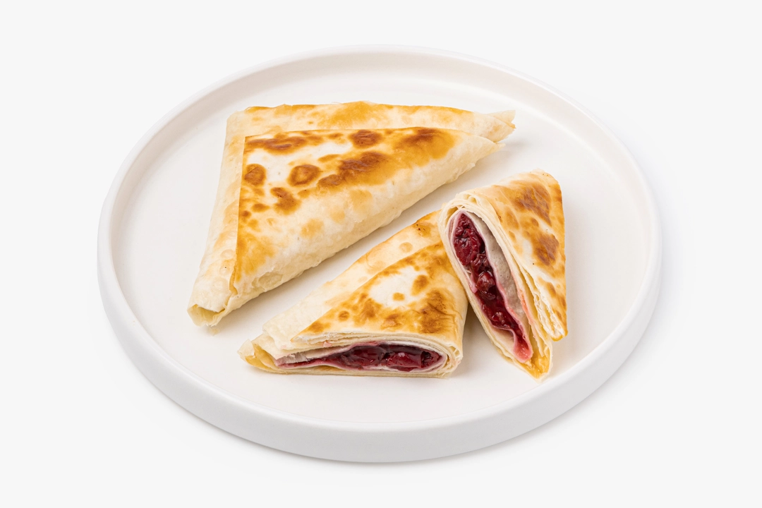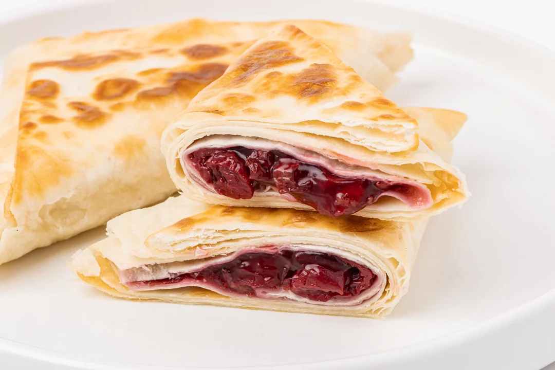 Конвертики из тонкого лаваша обжарены до румяной корочки. Внутри сладкая вишнёвая начинка