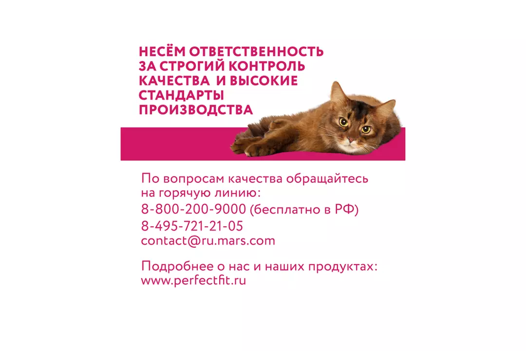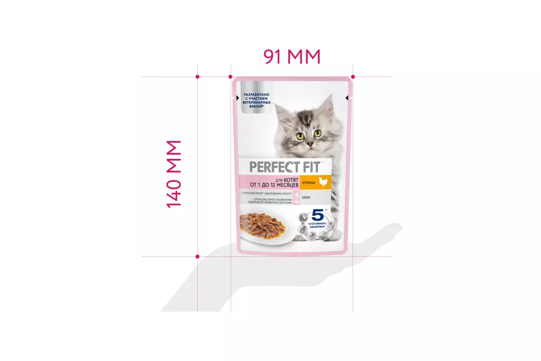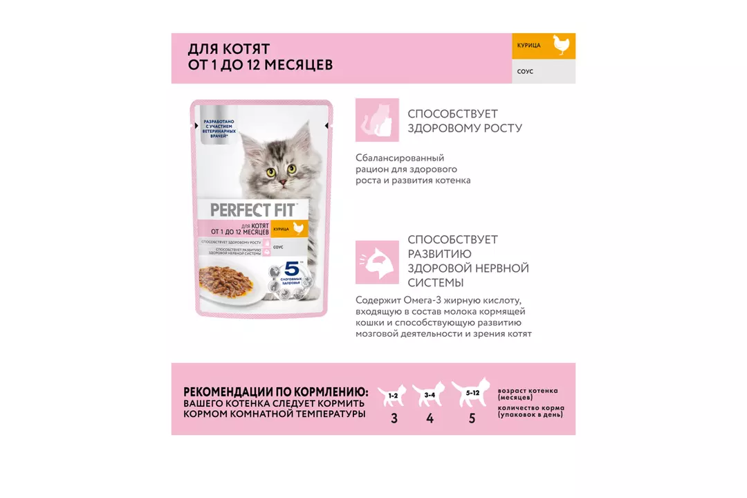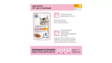 Влажный корм в паучах PERFECT FIT™ с курицей в соусе для котят разработан с учетом потребностей молодого растущего организма. Здоровый рост - Сбалансированный корм для здорового роста и развития котенка Здоровое развитие зрения и мозга - Помогает поддерживать зрение и здоровое развитие мозга благодаря содержанию ДГК из натуральных источников. Страна-производитель Россия