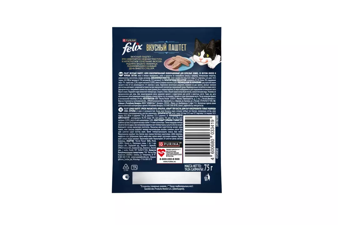 Для взрослой кошки среднего веса (4 кг) рекомендуется 3-4 пакетика в день. Кормление желательно разделить минимум на два приема. Данные значения рассчитаны для кошек с умеренной активностью при нормальной температуре окружающей среды. Индивидуальные потребности кошки могут варьироваться, и ежедневное количество корма должно быть скорректировано по мере необходимости для поддержания оптимального веса Вашей кошки. Подавайте корм комнатной температуры. Следите, чтобы у Вашей кошки всегда была чистая, свежая питьевая вода. Страна производитель-Россия