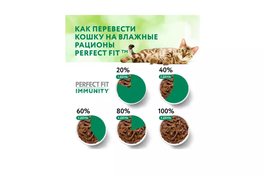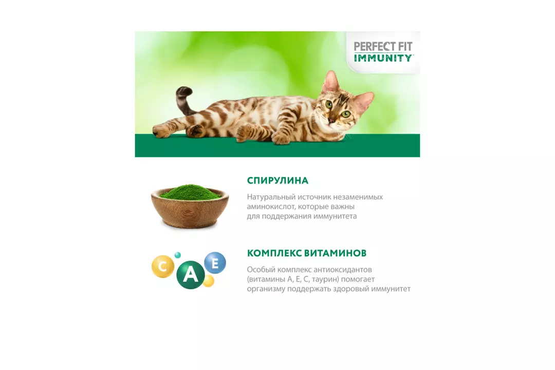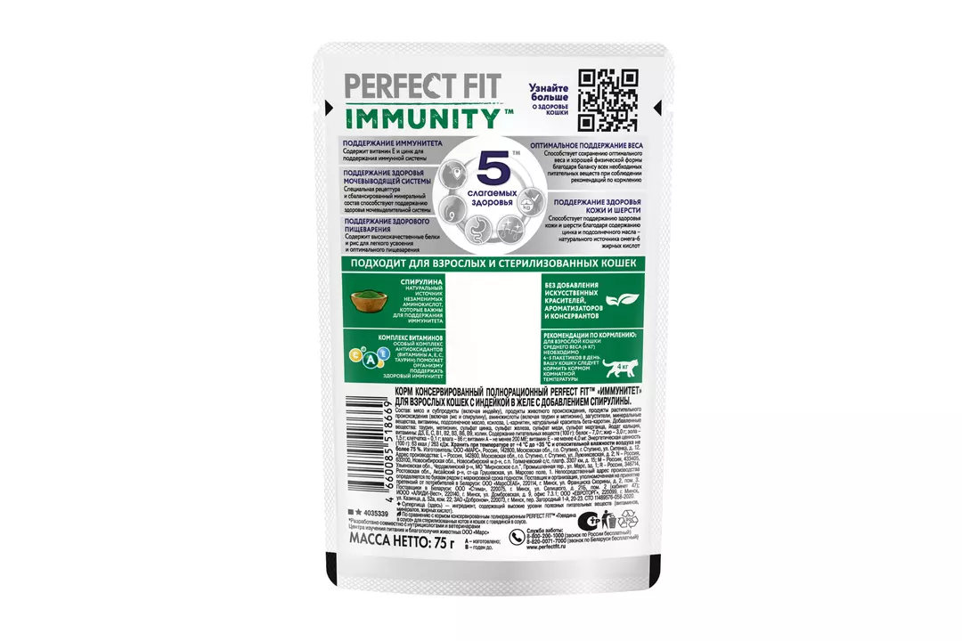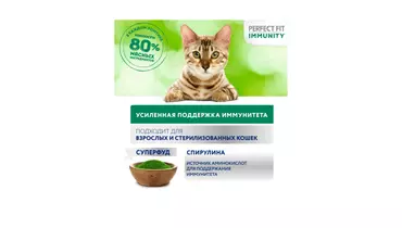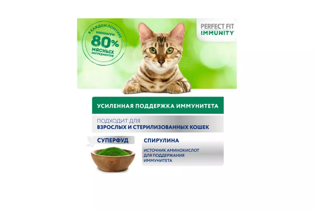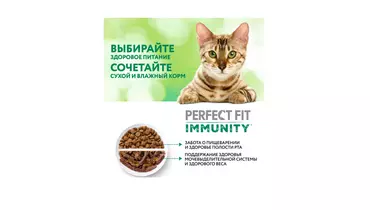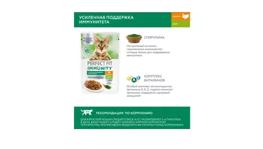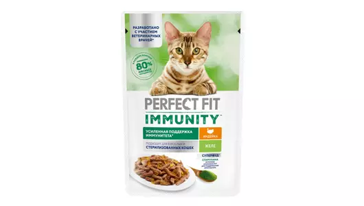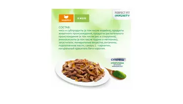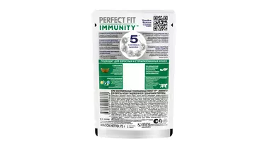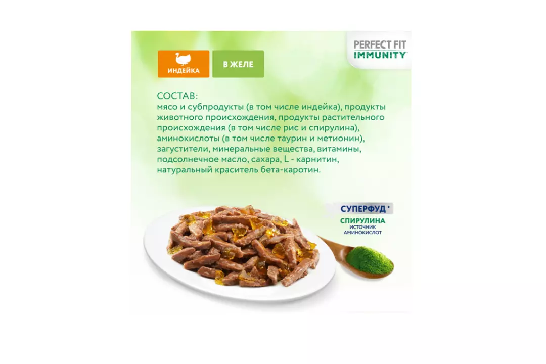 Разные факторы окружающей среды могут оказывать негативное влияние на здоровье наших питомцев. Поэтому так важно поддерживать их иммунитет. Профессиональный влажный рацион PERFECT FIT IMMUNITY™ с индейкой в желе содержит натуральные суперфуд ингредиенты (спирулину) с высокой концентрацией полезных веществ и незаменимых аминокислот, которые важны для поддержания иммунитета. Особый комплекс антиоксидантов (витамины A, E, C, таурин) в составе также помогает организму поддержать здоровый иммунитет. В основе рецептуры PERFECT FIT™ лежит уникальная формула, разработанная совместно с ветеринарами научно-исследовательного института Waltham (Волтхэм), которая комплексно заботится о важнейших слагаемых здоровья кошки: поддержании иммунитета, здоровье мочевыводящей системы, здоровом пищеварении, оптимальном поддержании веса и здоровье кожи и шерсти. Влажный корм для кошек PERFECT FIT IMMUNITY™ с индейкой в желе производится без добавления искусственных красителей, ароматизаторов и консервантов, а каждый ломтик содержит минимум 80% мясных ингредиентов. В линейке PERFECT FIT IMMUNITY™ представлены корма в паучах с индейкой и спирулиной и с говядиной и семенами льна , а также сухие рационы с говядиной, семенами льна, голубикой и с индейкой, спирулиной, клюквой. Рационы PERFECT FIT IMMUNITY™ подходят для всех котов и кошек, в том числе для стерилизованных. Особые потребности/назначение: Для взрослой кошки весом 2 кг необходимо 2 пакетика в день. Для взрослой кошки весом 3 кг необходимо 3 пакетика в день. Для взрослой кошки весом 4 кг необходимо 3-4 пакетика в день. Для взрослой кошки весом 5 кг необходимо 4 пакетика в день. Для взрослой кошки весом 6 кг необходимо 5 пакетиков в день. Для взрослой кошки весом 7 кг необходимо 5,5 пакетиков в день. Для взрослой кошки весом 8 кг необходимо 6 пакетиков в день. Для взрослой кошки весом 9 кг необходимо 6,5 пакетиков в день. Для взрослой кошки весом 10 кг необходимо 7 пакетиков в день. Вашу кошку следует кормить кормом комнатной температуры.