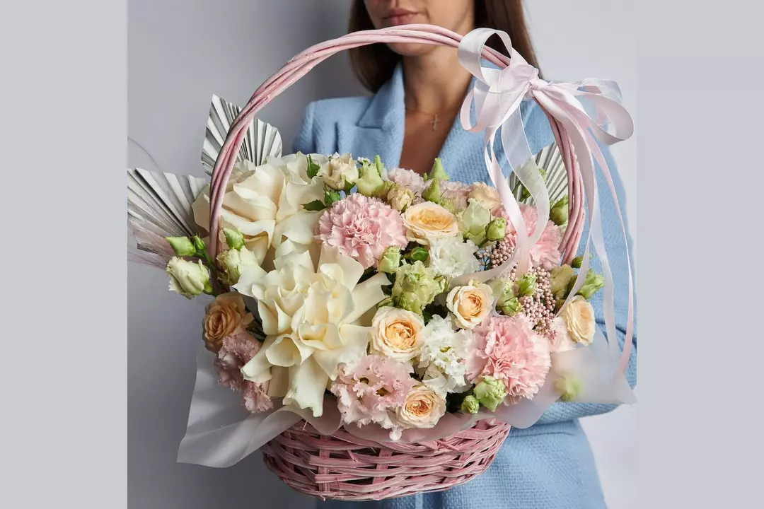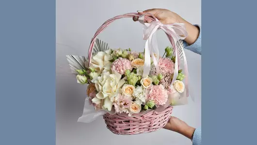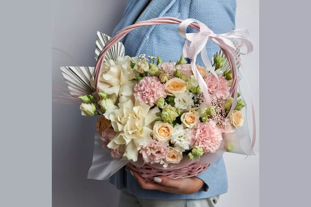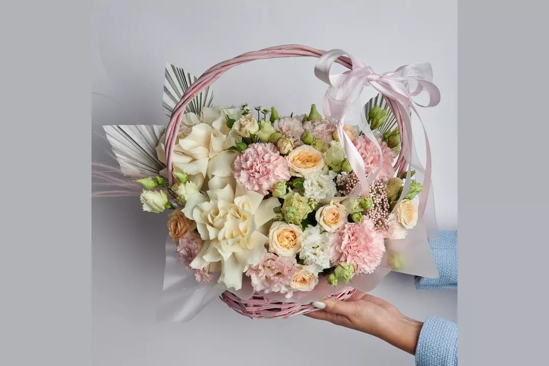 Корзина с французскими розами, эустомой и диантусами FMART by flowwow