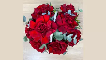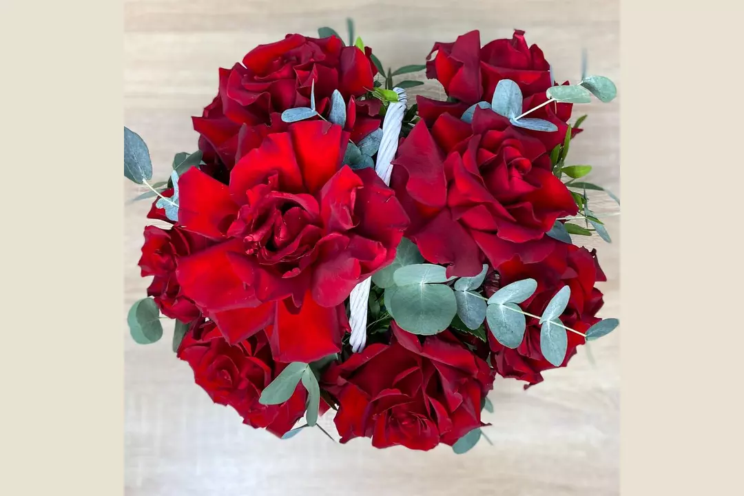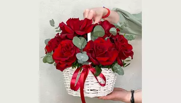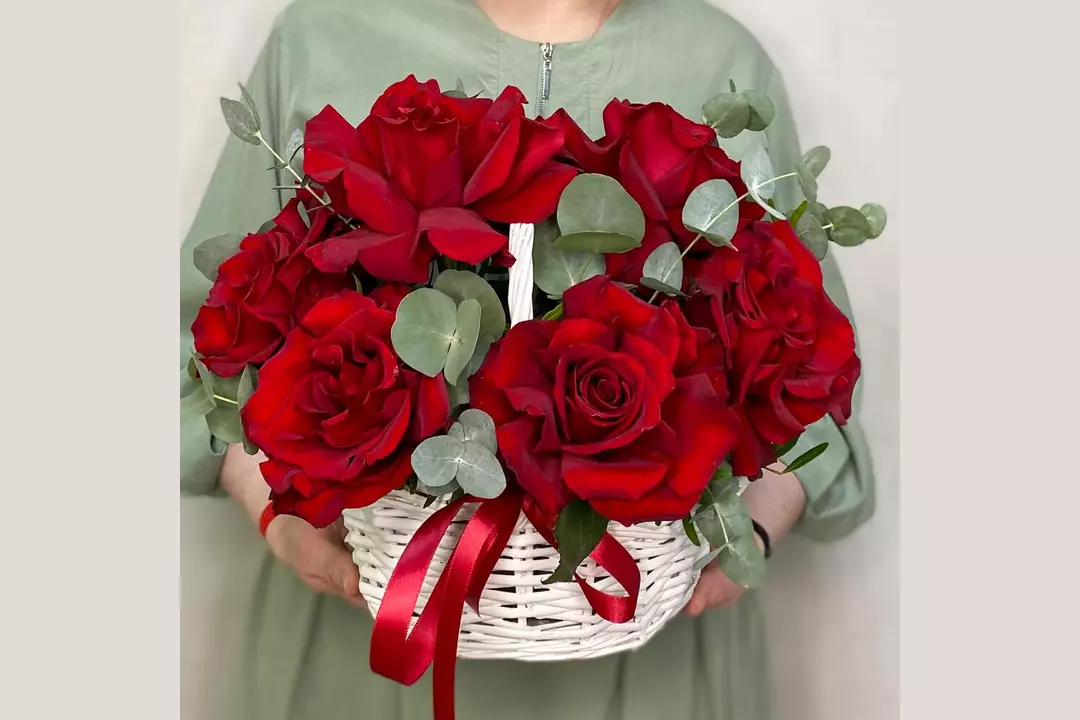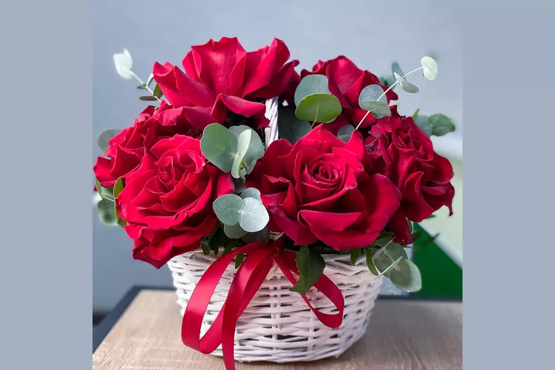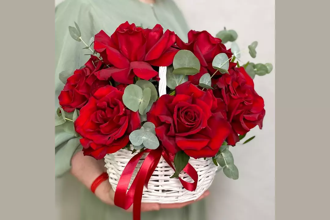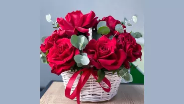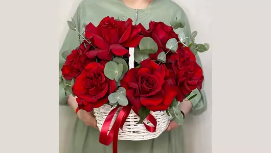 Роскошные ярко-красные французские розы с ветками ароматного эвкалипта, с сочной зеленью фисташки в небольшой белой корзине станут прекрасным подарком. Состав: Писташ - 2 шт. Эвкалипт - 3 шт. Лента атласная - 1 шт. Корзина плетеная - 1 шт. Роза французская - 9 шт. Губка флористическая - 1 шт.
