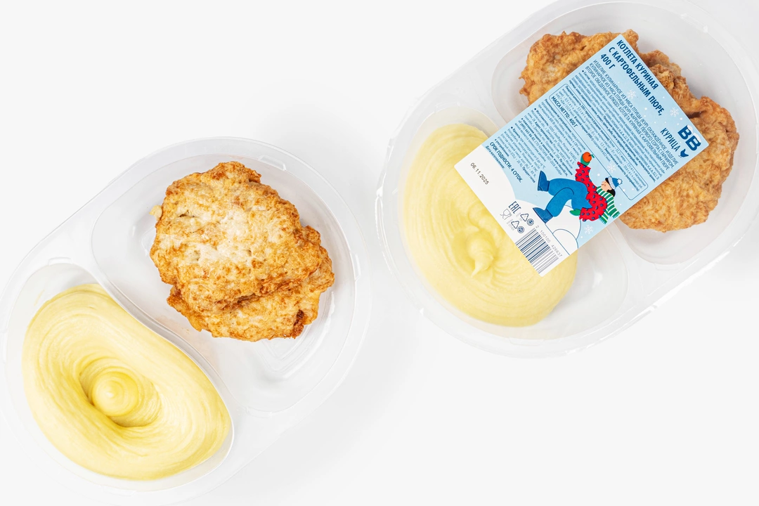 Домашнее блюдо для сытного обеда. Порция большая — 400 г: хватит, даже если вы очень проголодались. Аппетитная золотистая котлета из куриного филе отлично сочетается с гарниром. Пюре приготовлено из отборного картофеля, с молоком, сливками и сливочным маслом — воздушное и нежное!