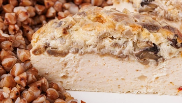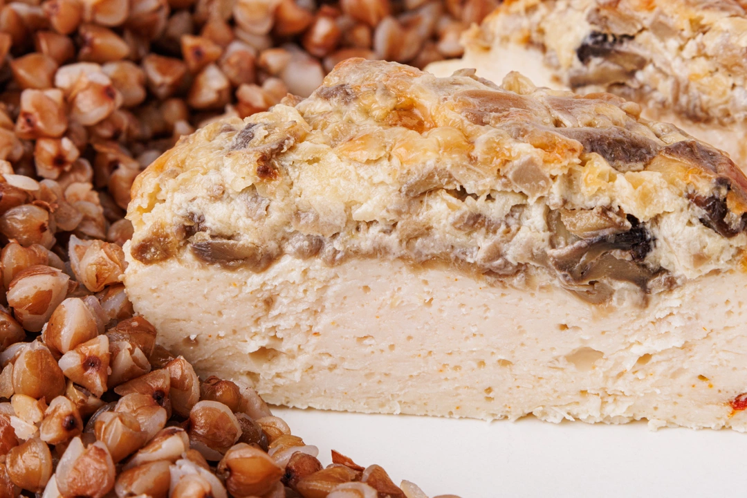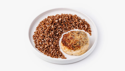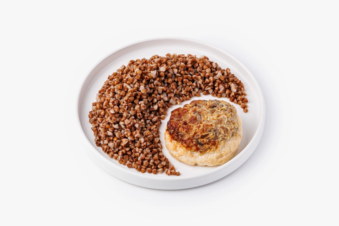 Котлета куриная запеченная под сырно-грибной шапкой с гречкой
