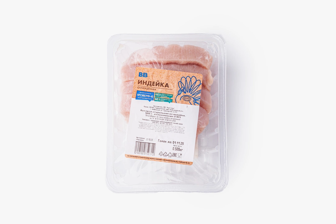 Филе грудки индейки, нарезанное на равные кусочки. Идеальный вариант, когда хочется потратить минимум времени на готовку. Чтобы сохранить вкус и сочность мяса, советуем быструю обжарку. Выложите котлеты на раскалённую сковороду с растительным маслом. Обжарьте по 3–4 минуты с каждой стороны и добавьте любимые специи. Накройте крышкой, убавьте огонь и готовьте ещё 5–6 минут.